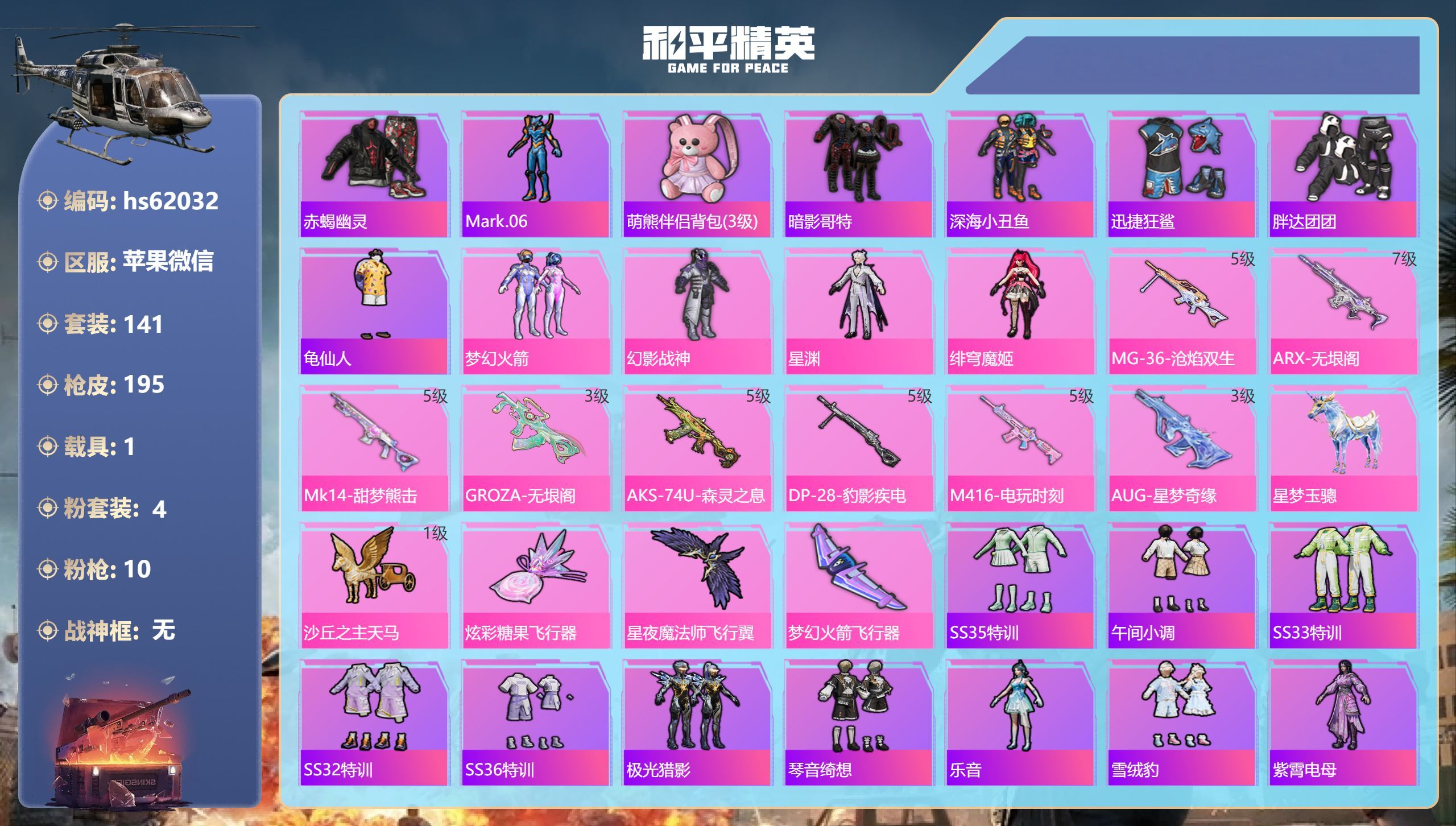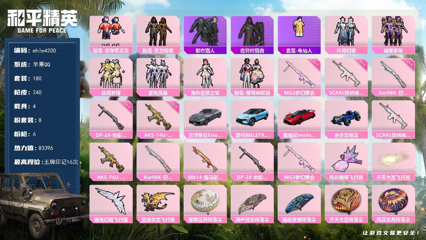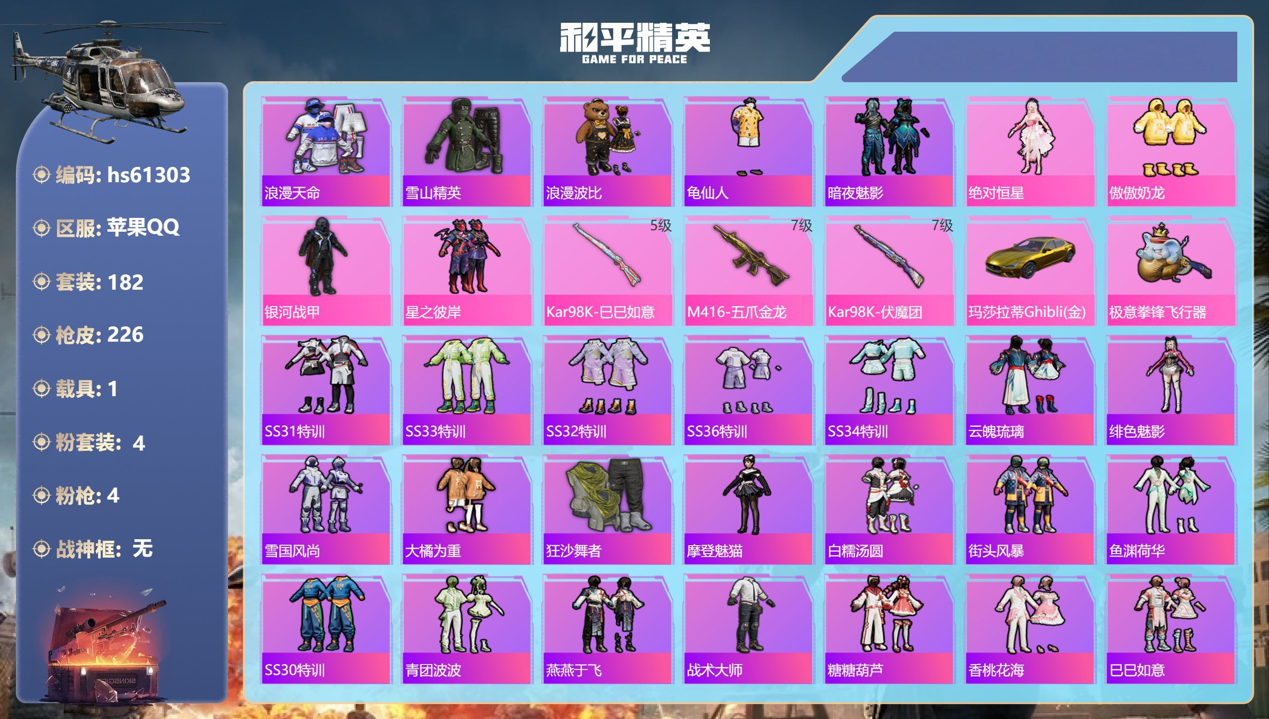hs61303 苹果手Q-16王牌印记-4粉装-4特效枪-1载具-77103热力值-182套装-22