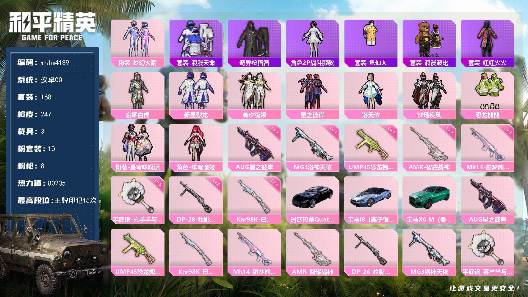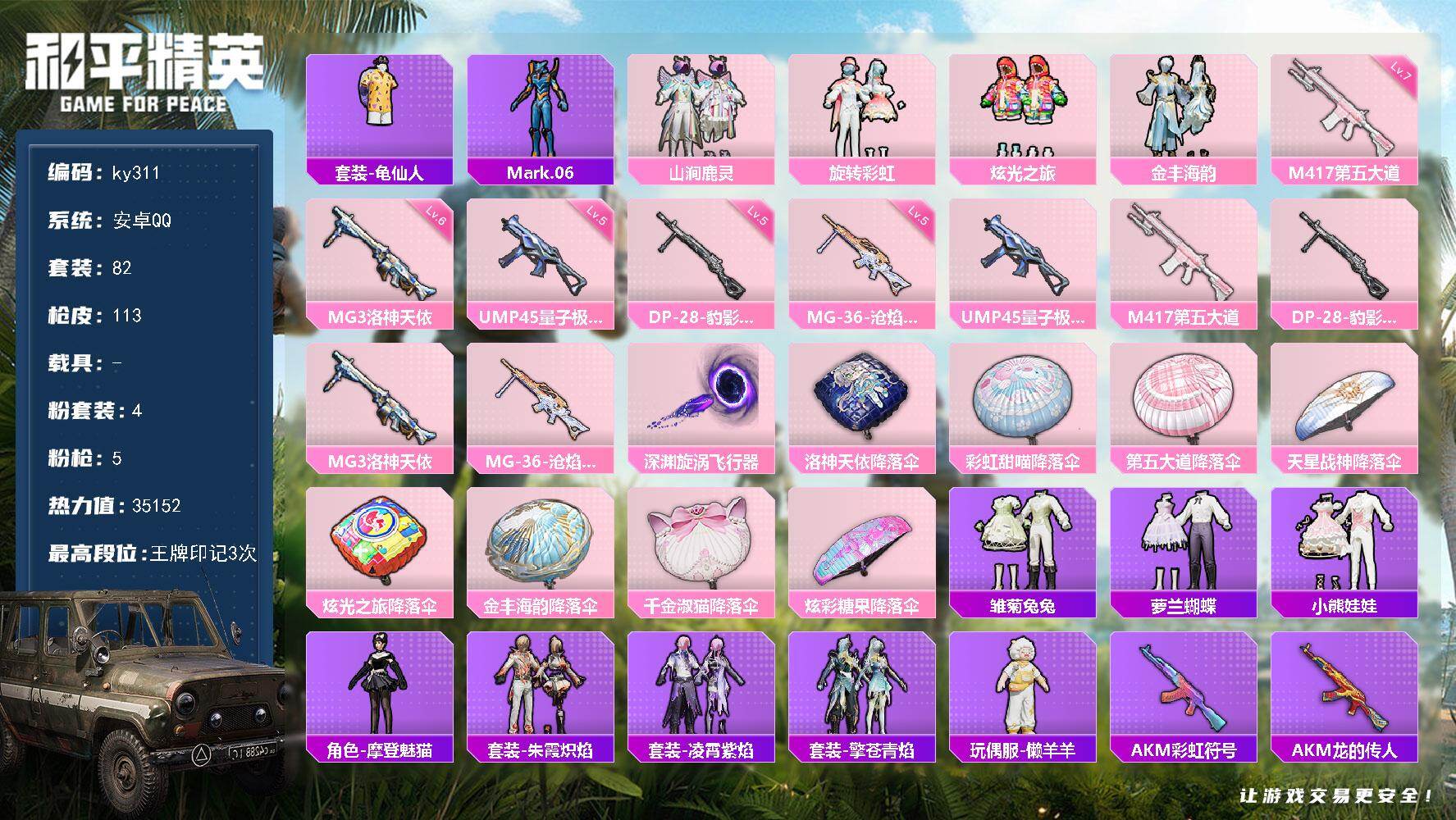安卓 手Q-4粉装-5特效枪-0载具-2粉色飞行器-35152热力值-3王牌印