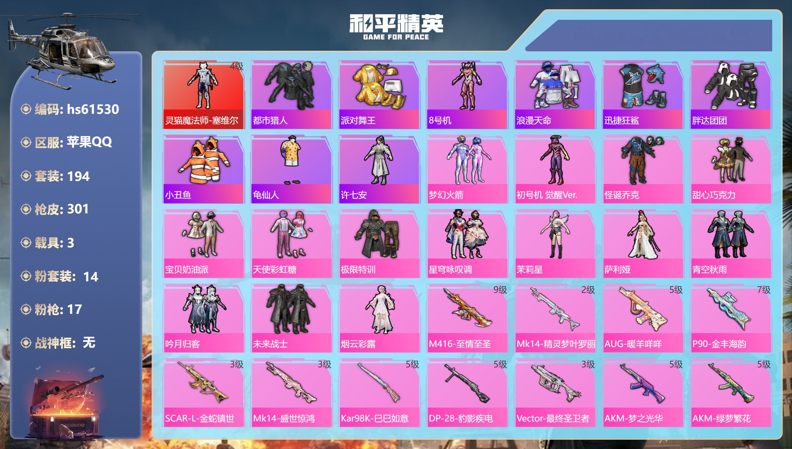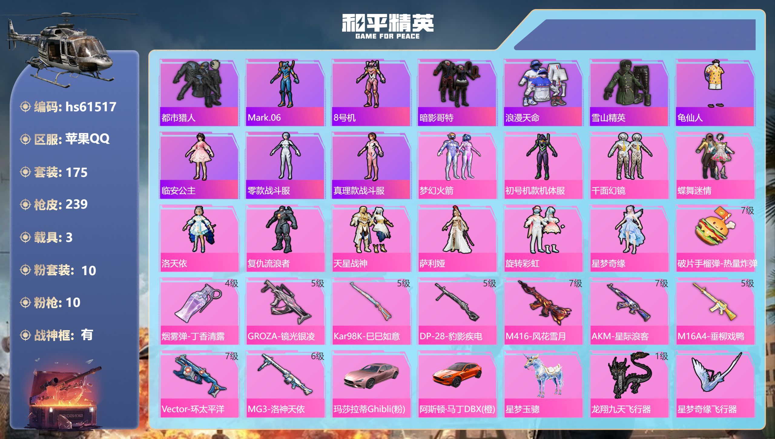 hs61517 苹果手Q-10王牌印记-有战神框-10粉装-10特效枪-3载具-83562热力值-1