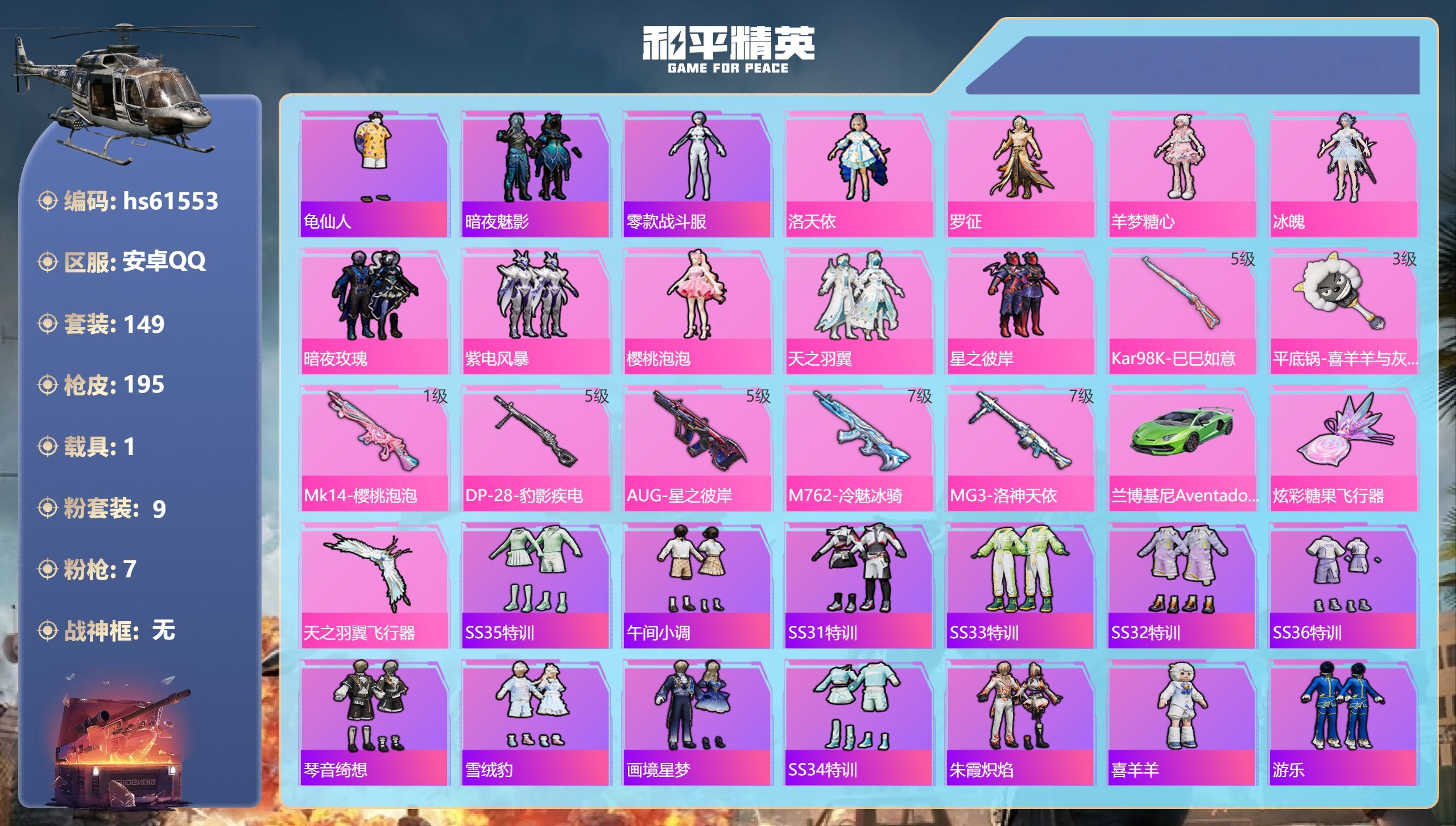 hs61553 安卓手Q-5王牌印记-9粉装-7特效枪-1载具-67038热力值-149套装-195