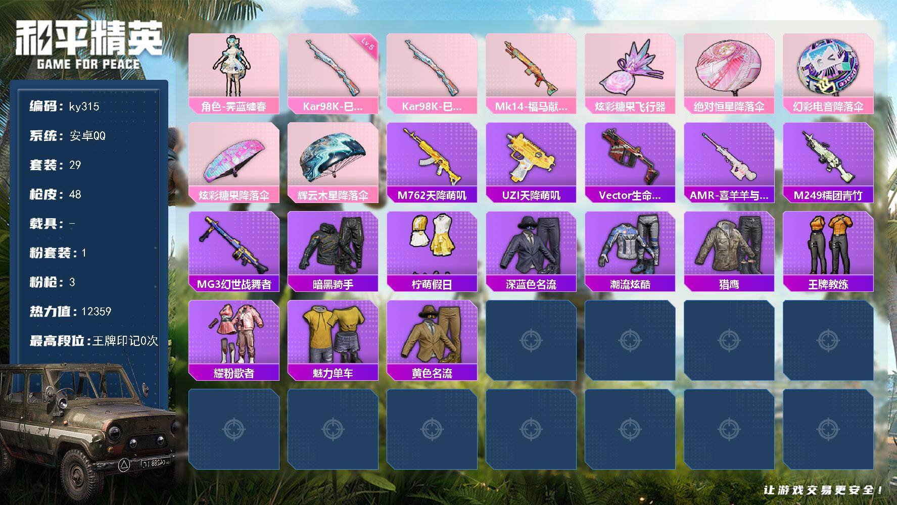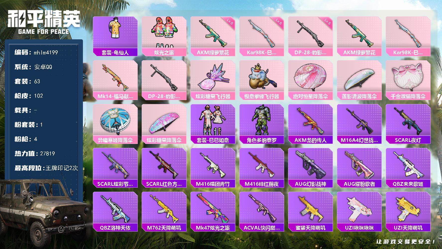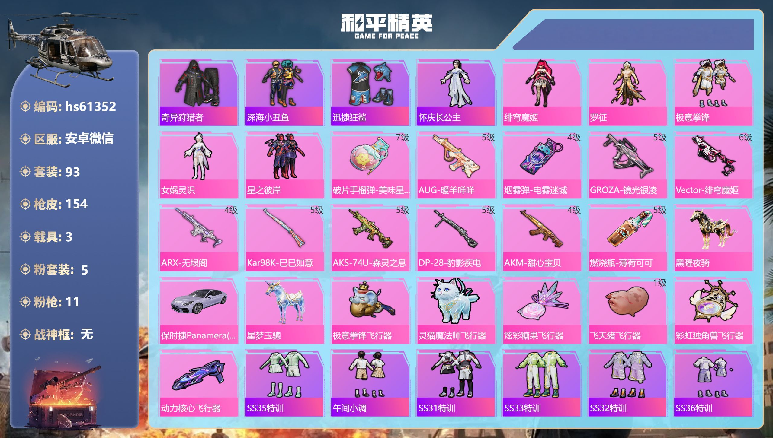 hs61352 安卓微-5王牌印记-5粉装-11特效枪-3载具-48809热力值-93套装-154