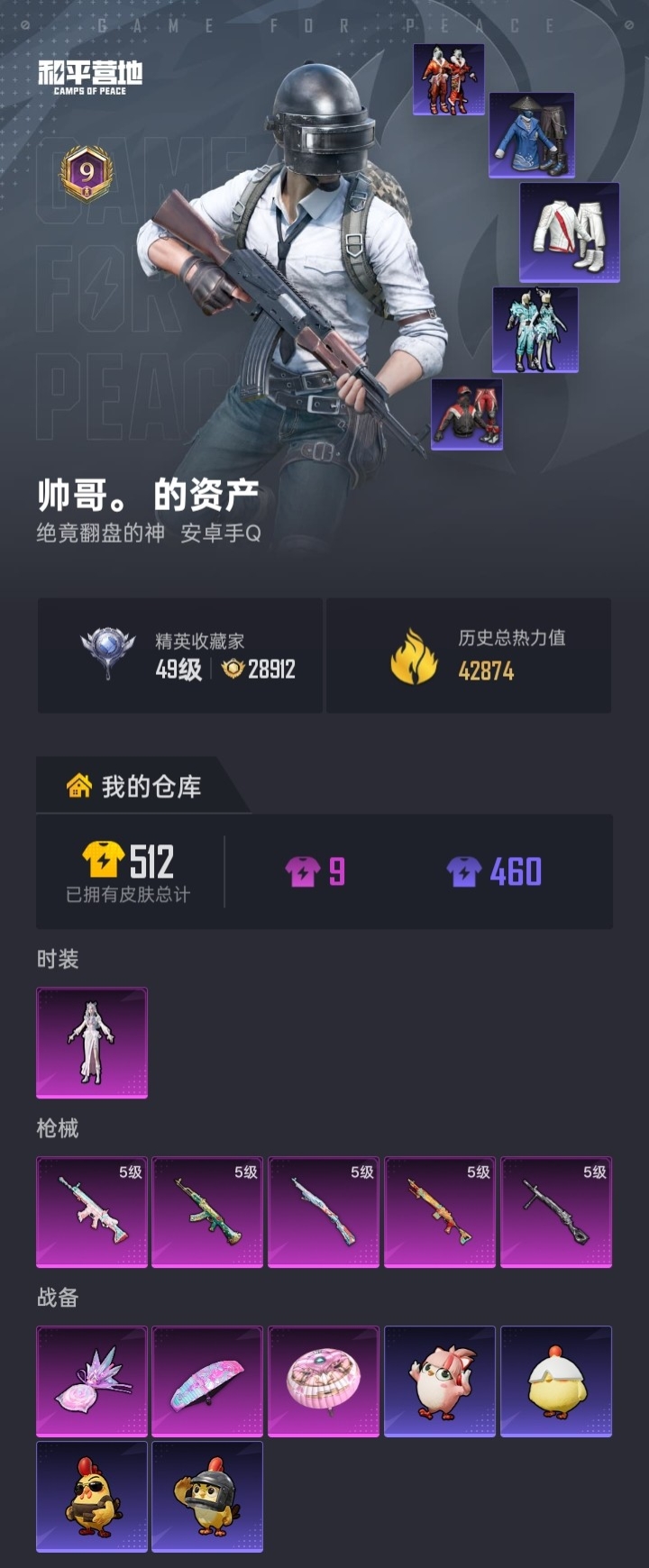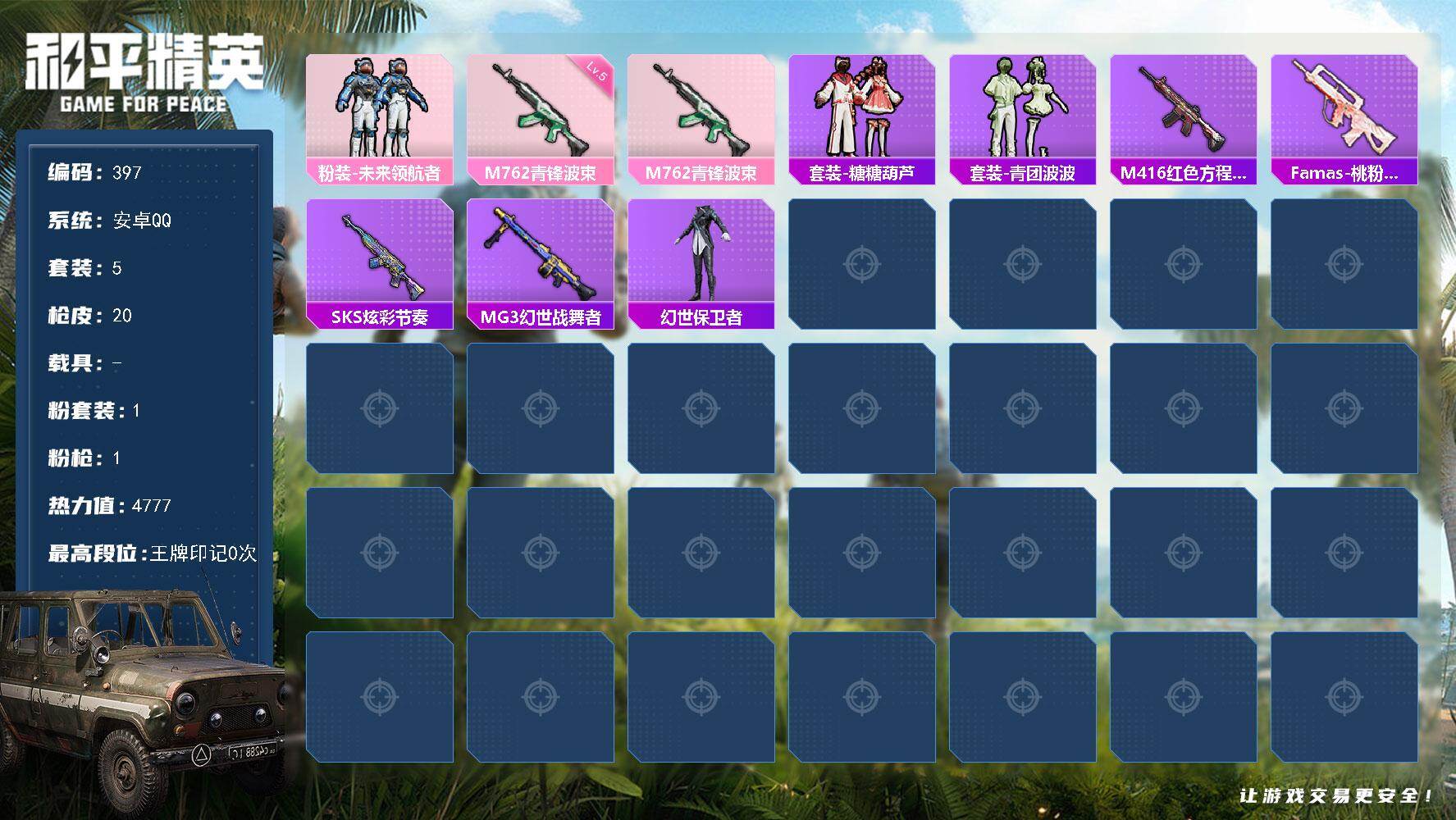 安卓 手Q-1粉装-1特效枪-0载具-0粉色飞行器-4777热力值-0王牌印记