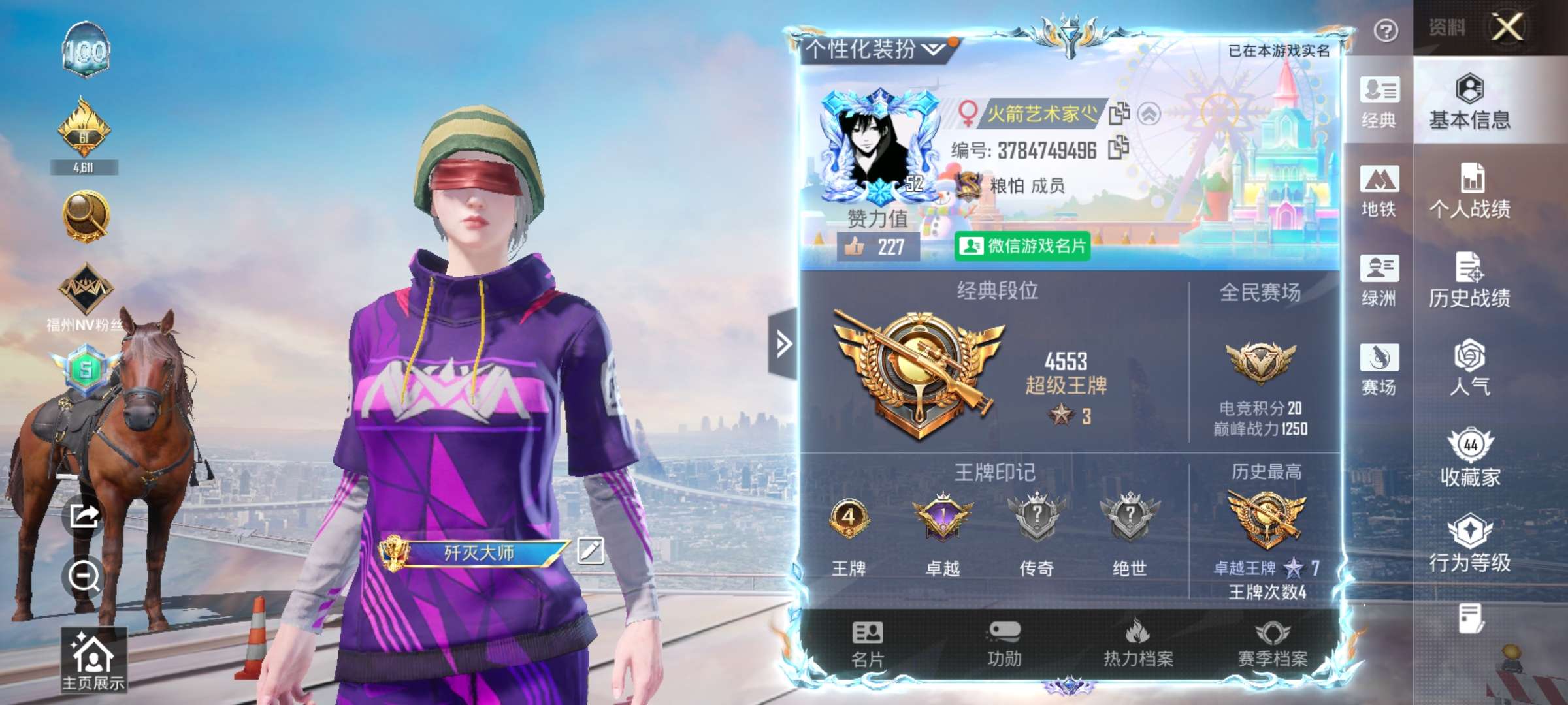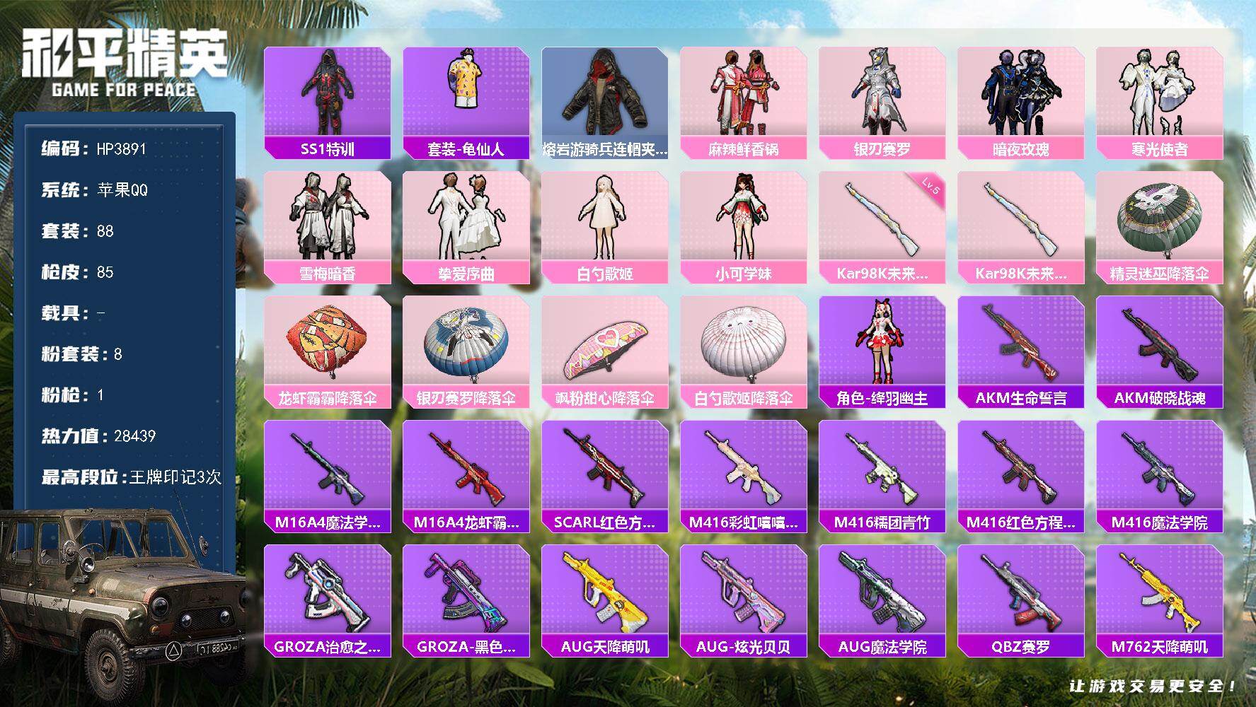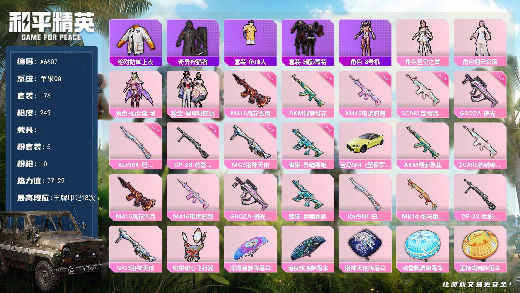 安卓 手Q-4粉装-3特效枪-0载具-0粉色飞行器-16712热力值-1王牌印