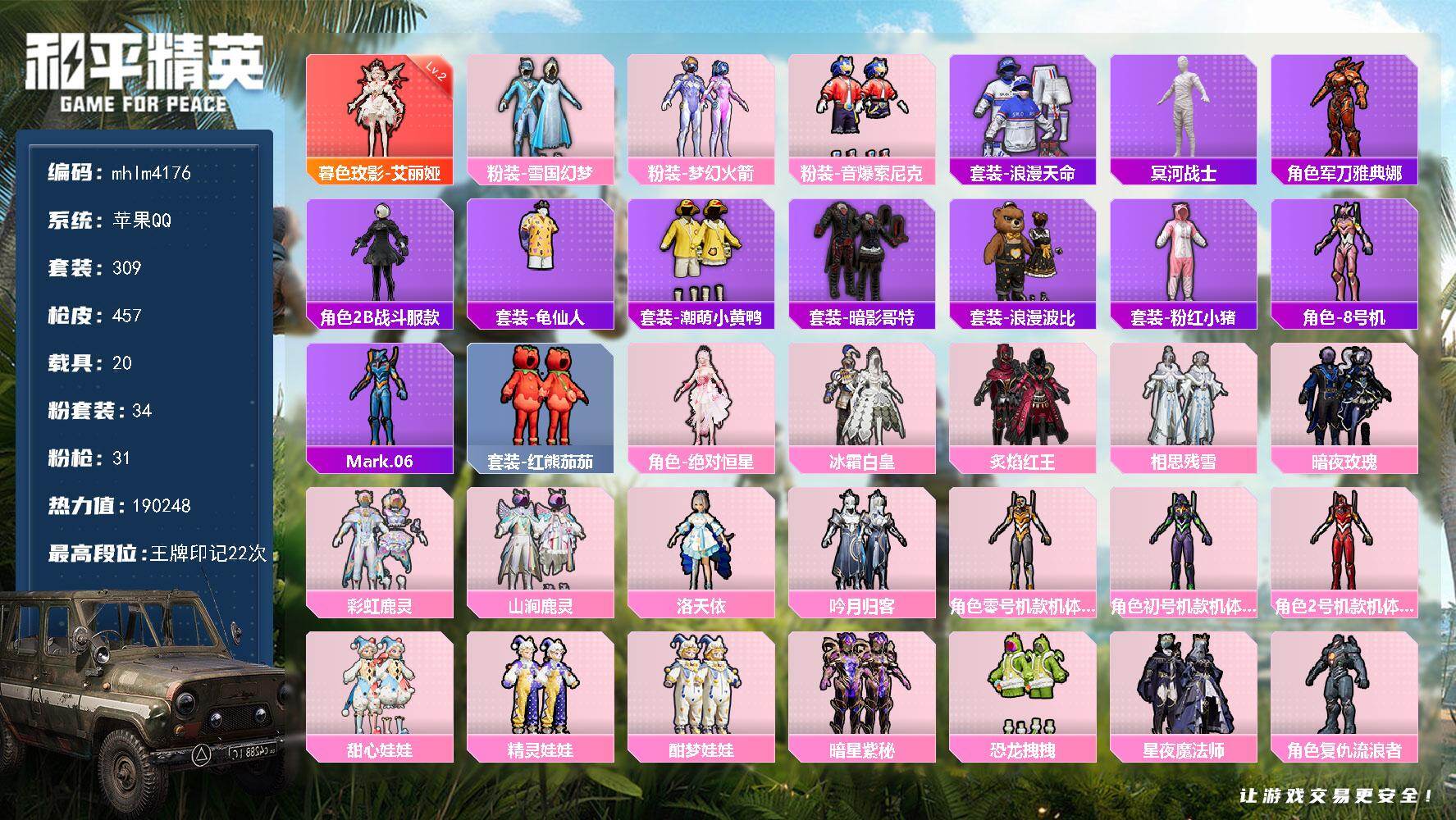 【mhlm4176】苹果 手Q-1神装-34粉装-31特效枪-20载具-24粉