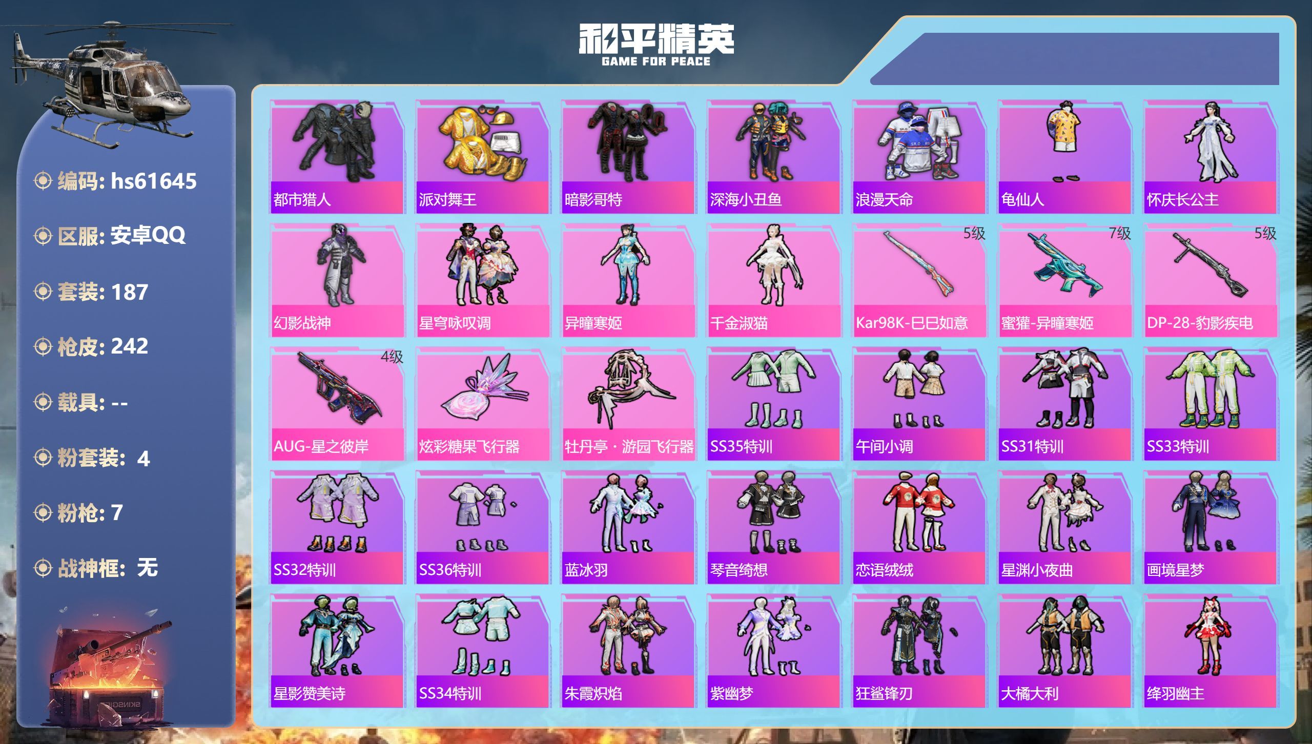 hs61645 安卓手Q-14王牌印记-4粉装-7特效枪-69587热力值-187套装-242枪皮-
