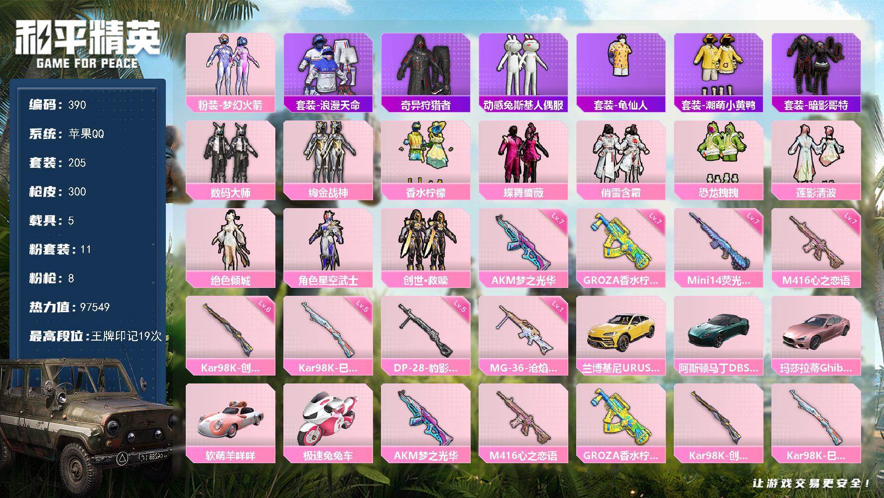 苹果 手Q-11粉装-8特效枪-5载具-3粉色飞行器-97549热力值-19王