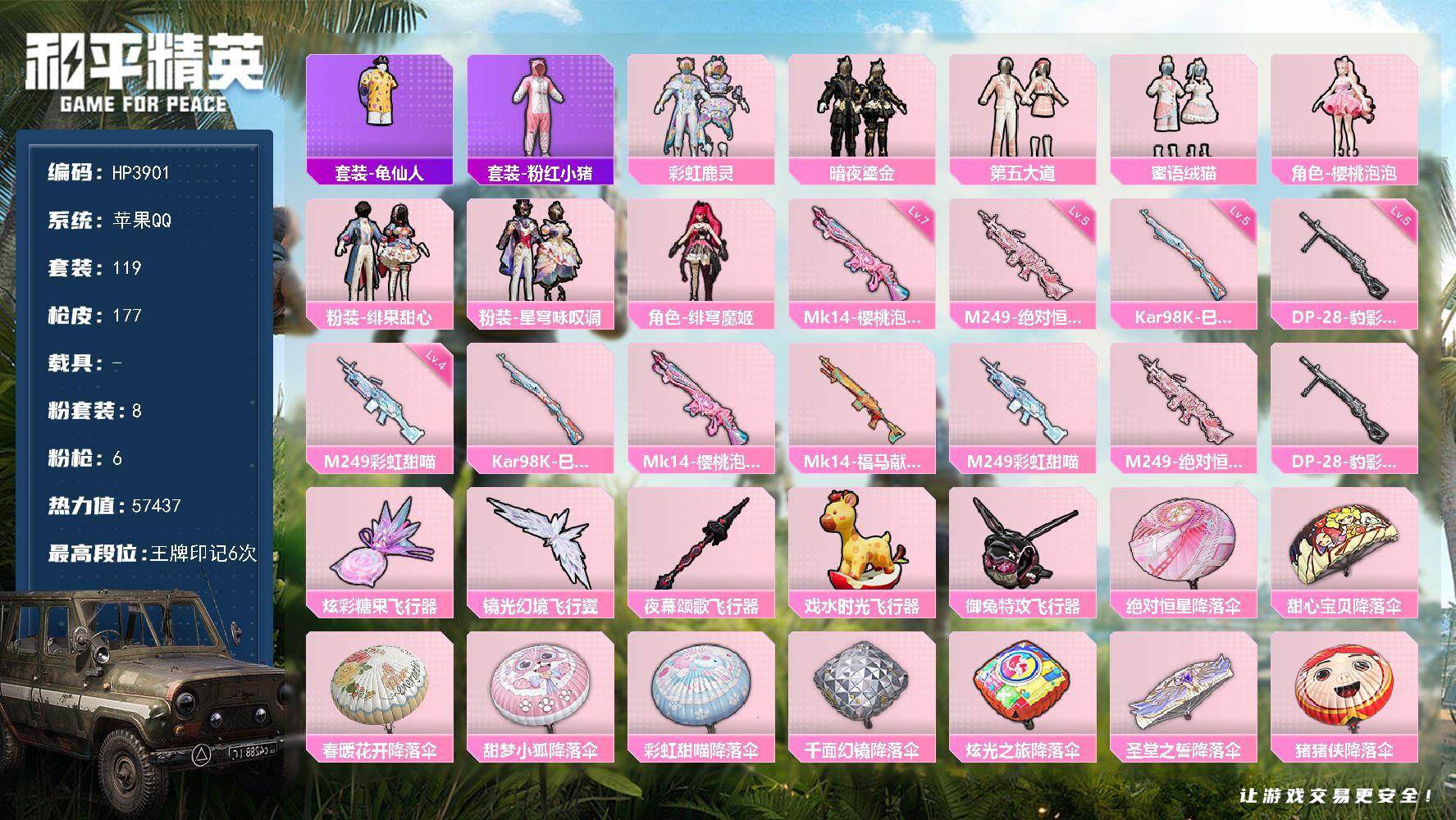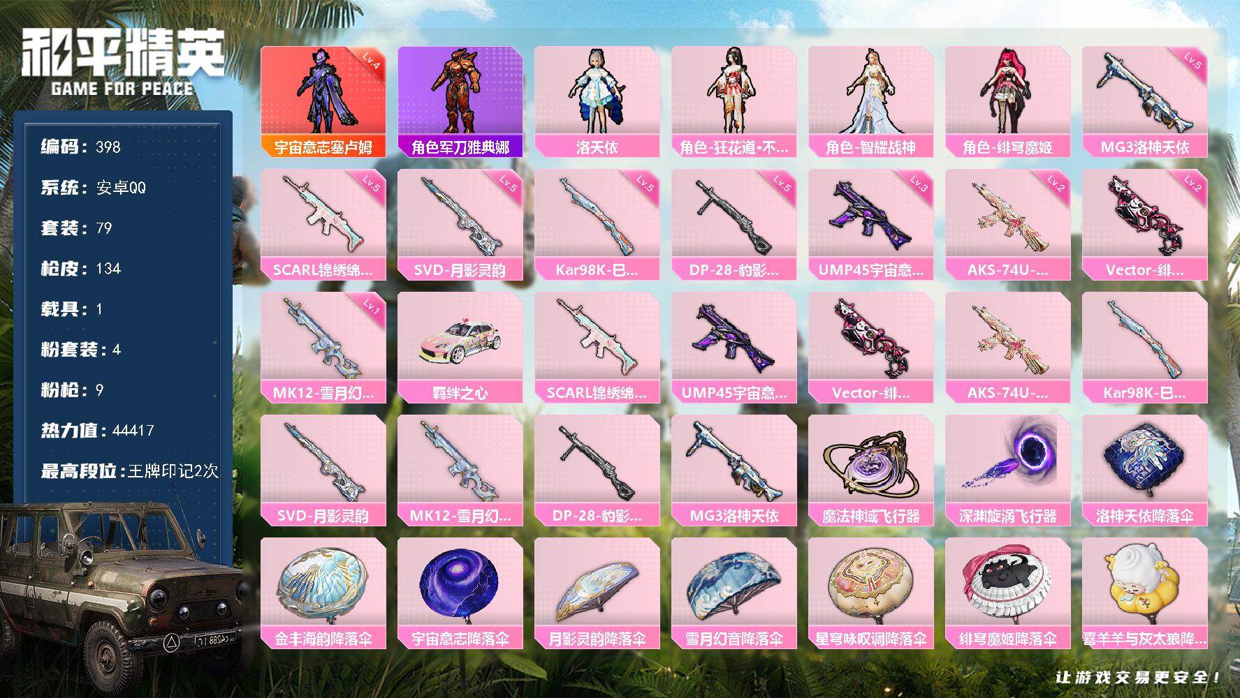 安卓 手Q-1神装-4粉装-9特效枪-1载具-3粉色飞行器-44417热力值-