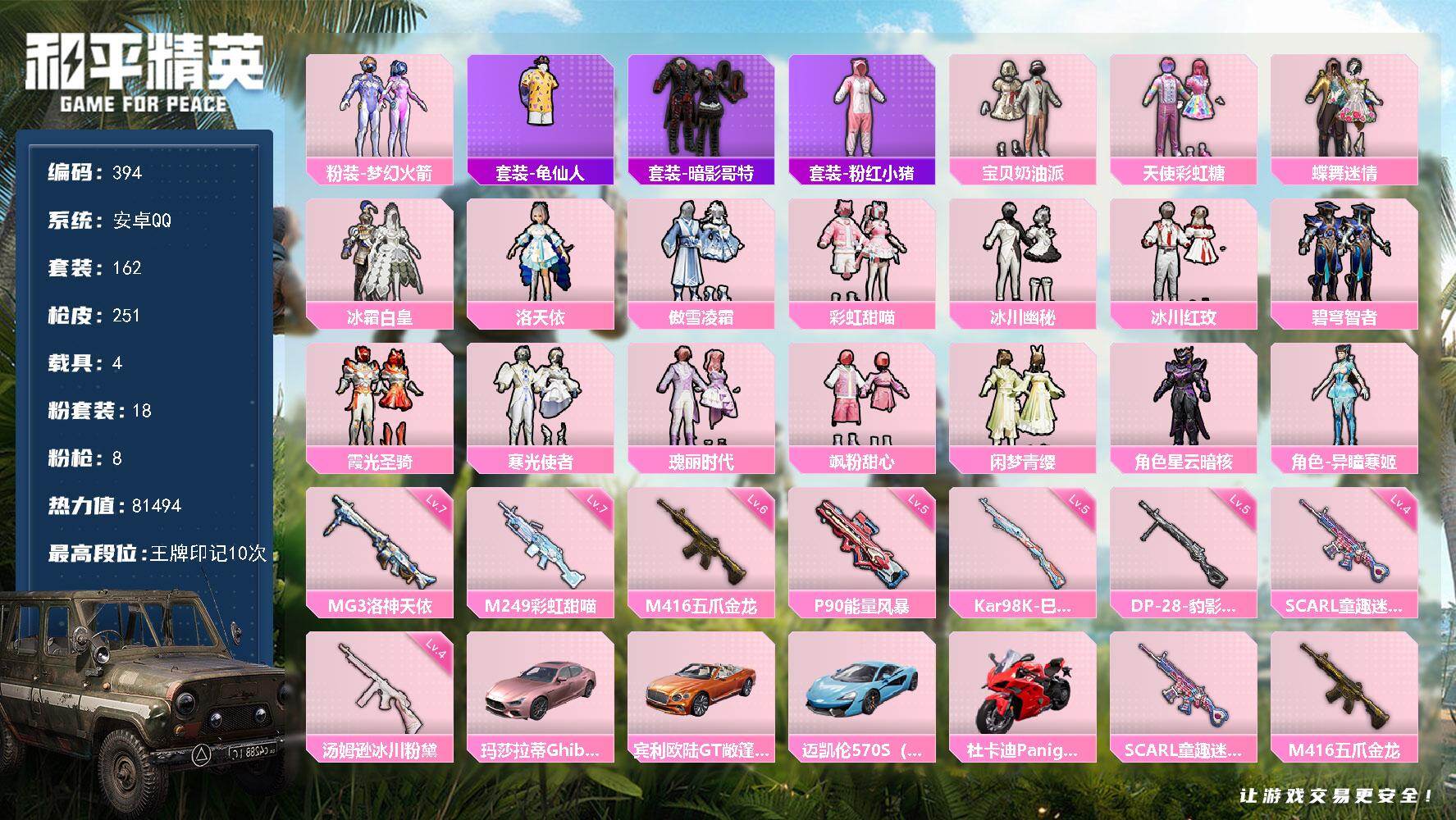 安卓 手Q-18粉装-8特效枪-4载具-3粉色飞行器-81494热力值-10王
