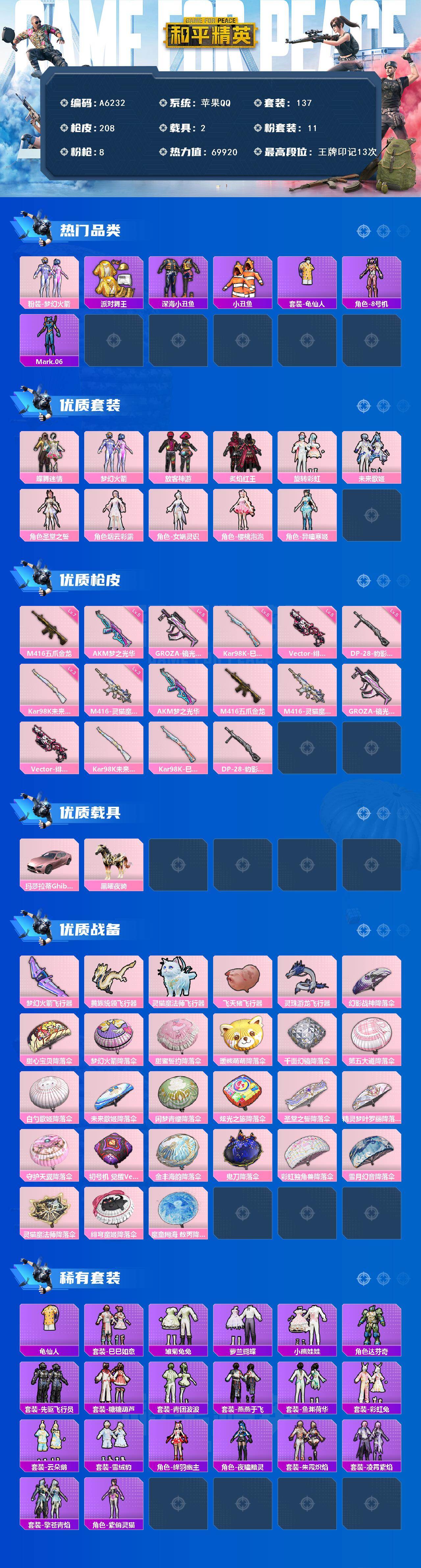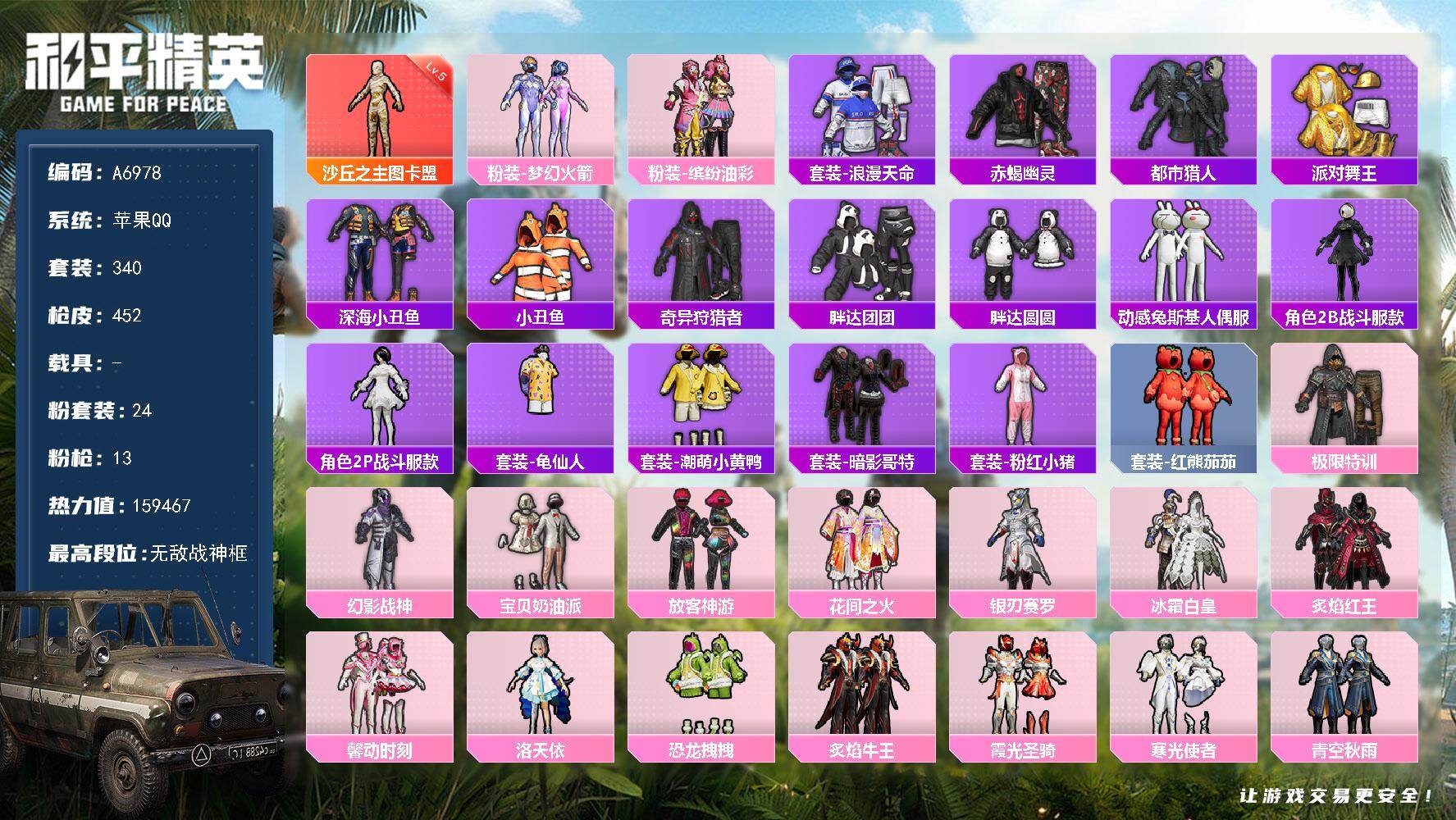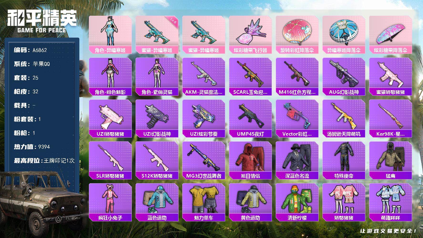 苹果 手Q-1粉装-1特效枪-0载具-1粉色飞行器-9394热力值-1王牌印记-25套装-32枪皮