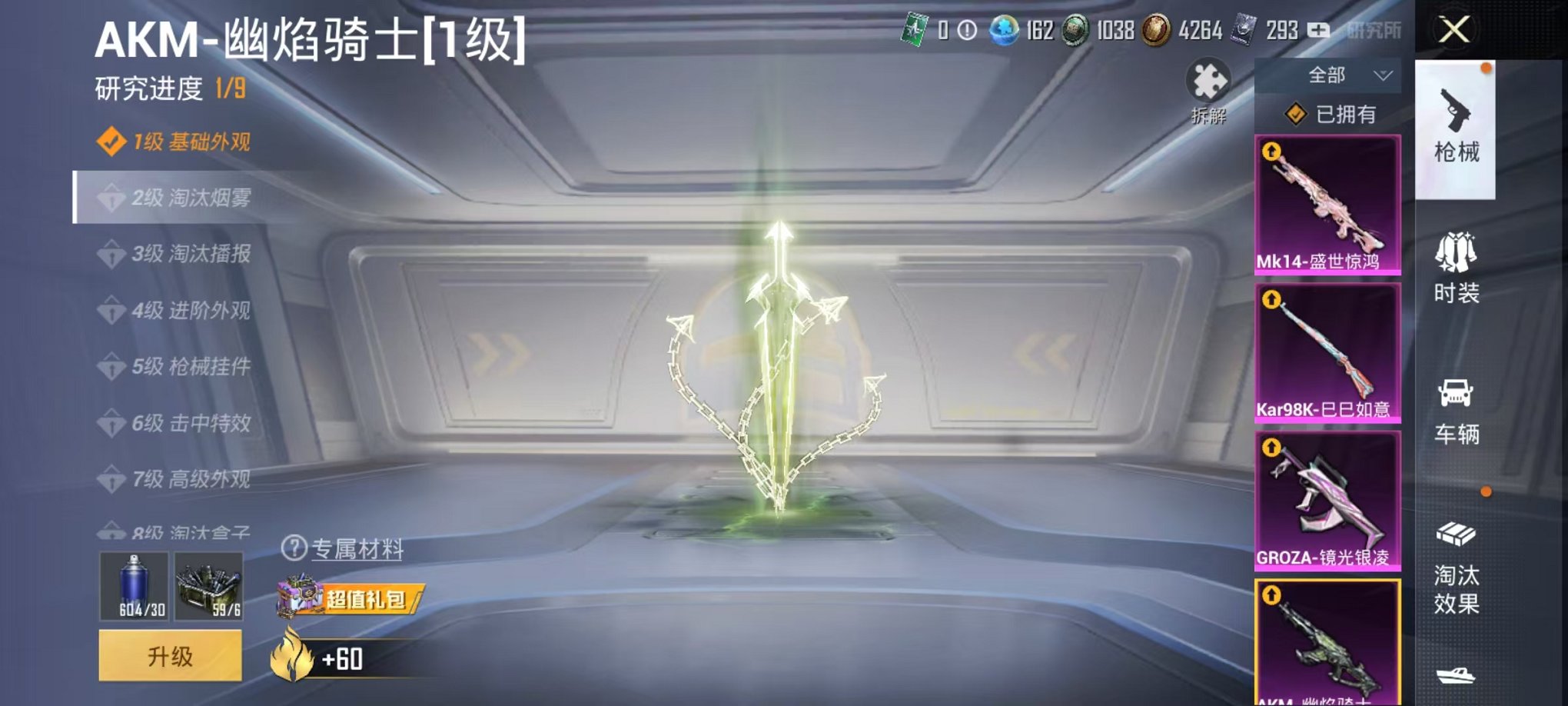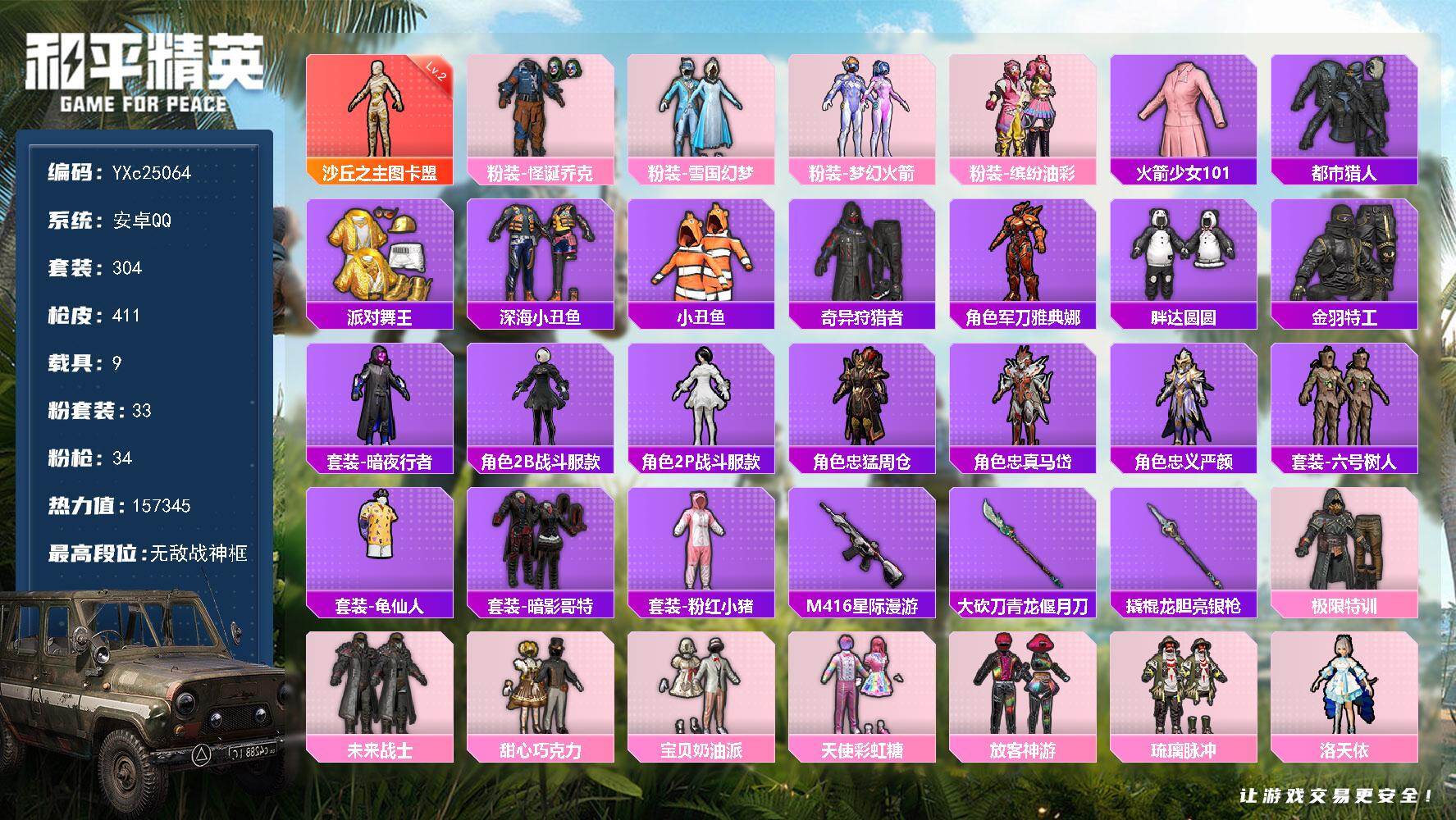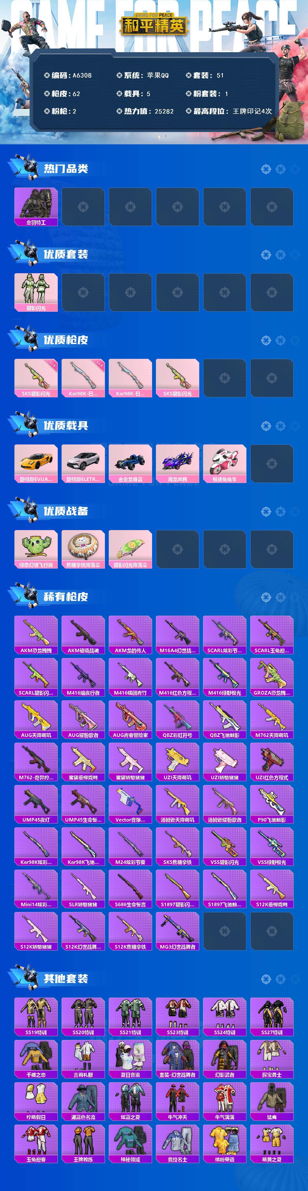 苹果 手Q-1粉装-1特效枪-0载具-1粉色飞行器-9394热力值-1王牌印记-25套装-32枪皮