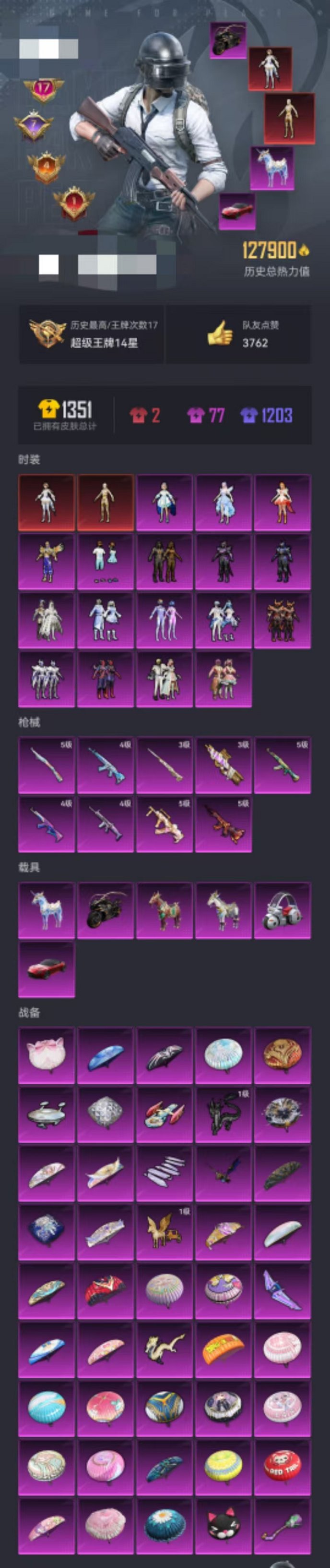 327-【连体号4级灵猫1级欧若拉黑丝12粉装5特效枪5载具带王者311皮肤2无