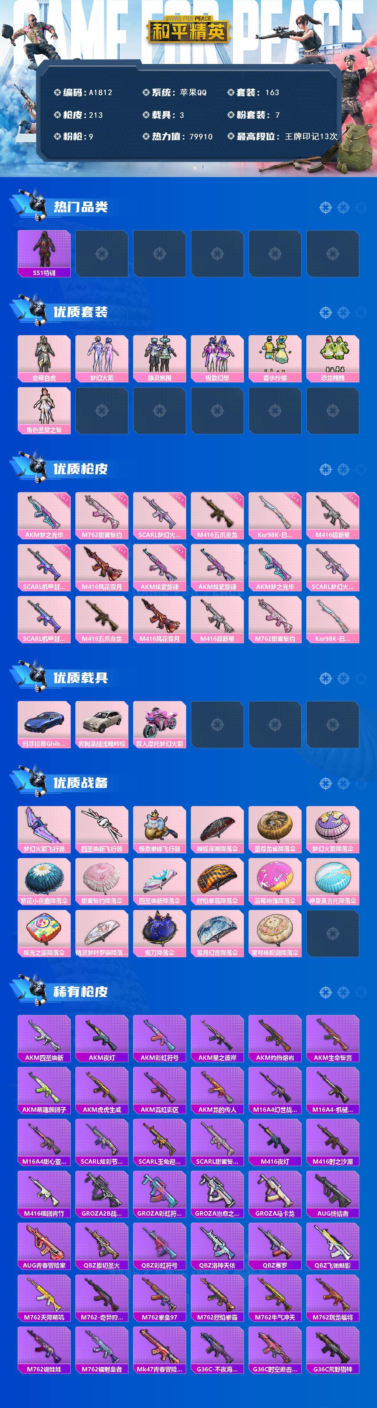 安卓QQ-无二次包人脸-9王牌印记-9粉装-5红装-20特效枪-8载具-110644热力值-战备72