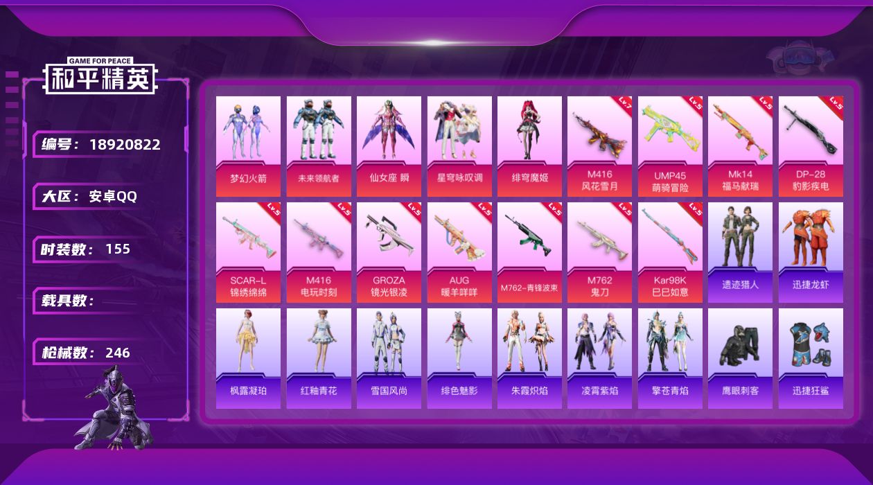 安卓 手Q-4粉装-5特效枪-0载具-0粉色飞行器-31026热力值-2王牌印记