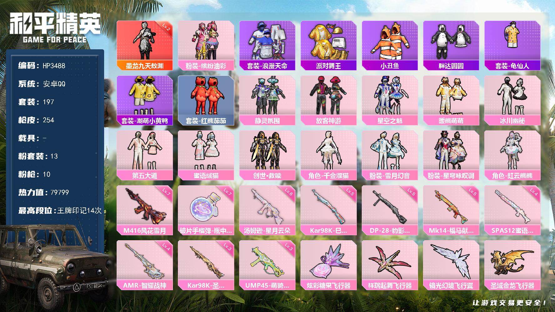安卓 手Q-4粉装-6特效枪-2载具-2粉色飞行器-40700热力值-4王牌印记
