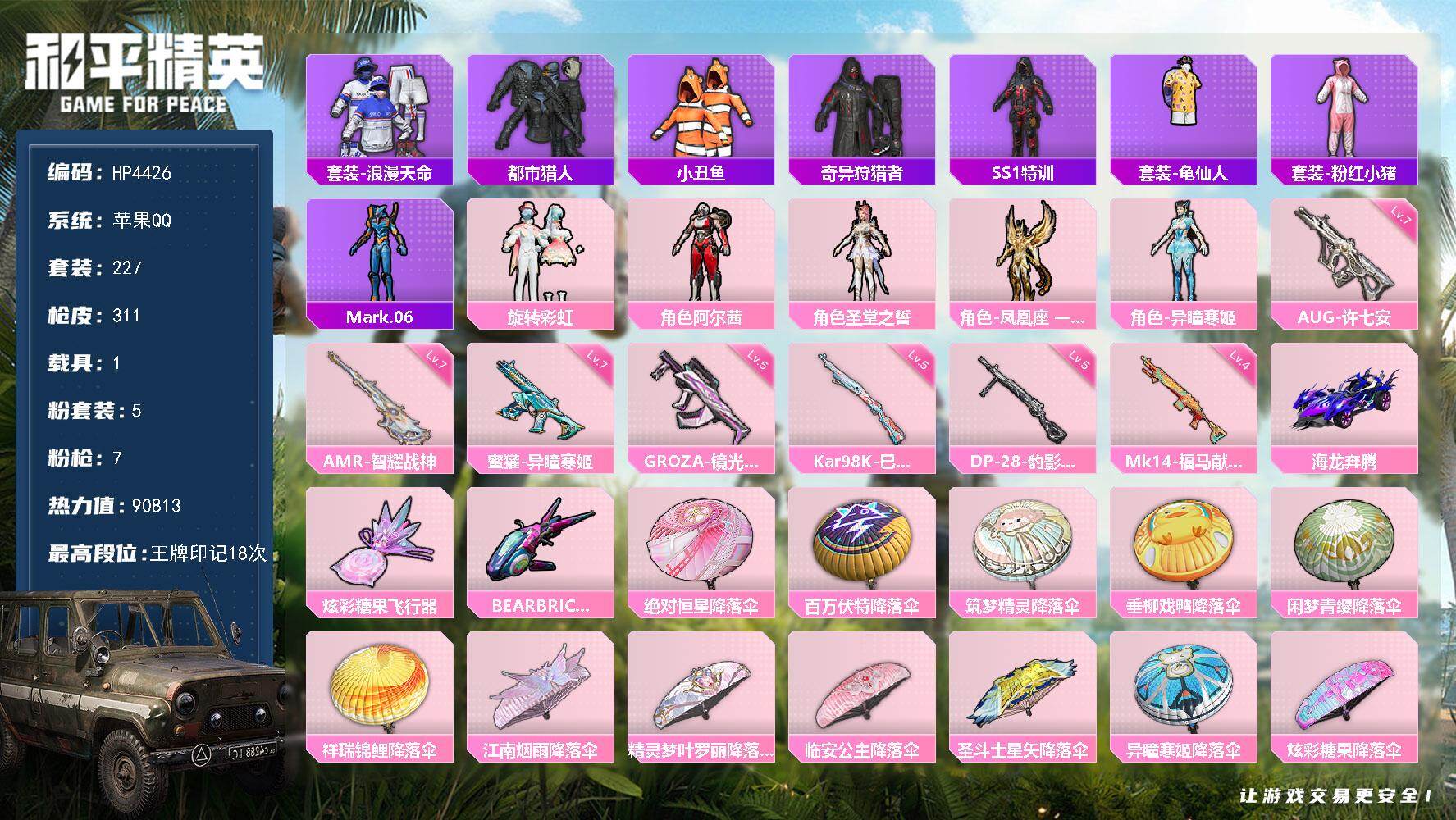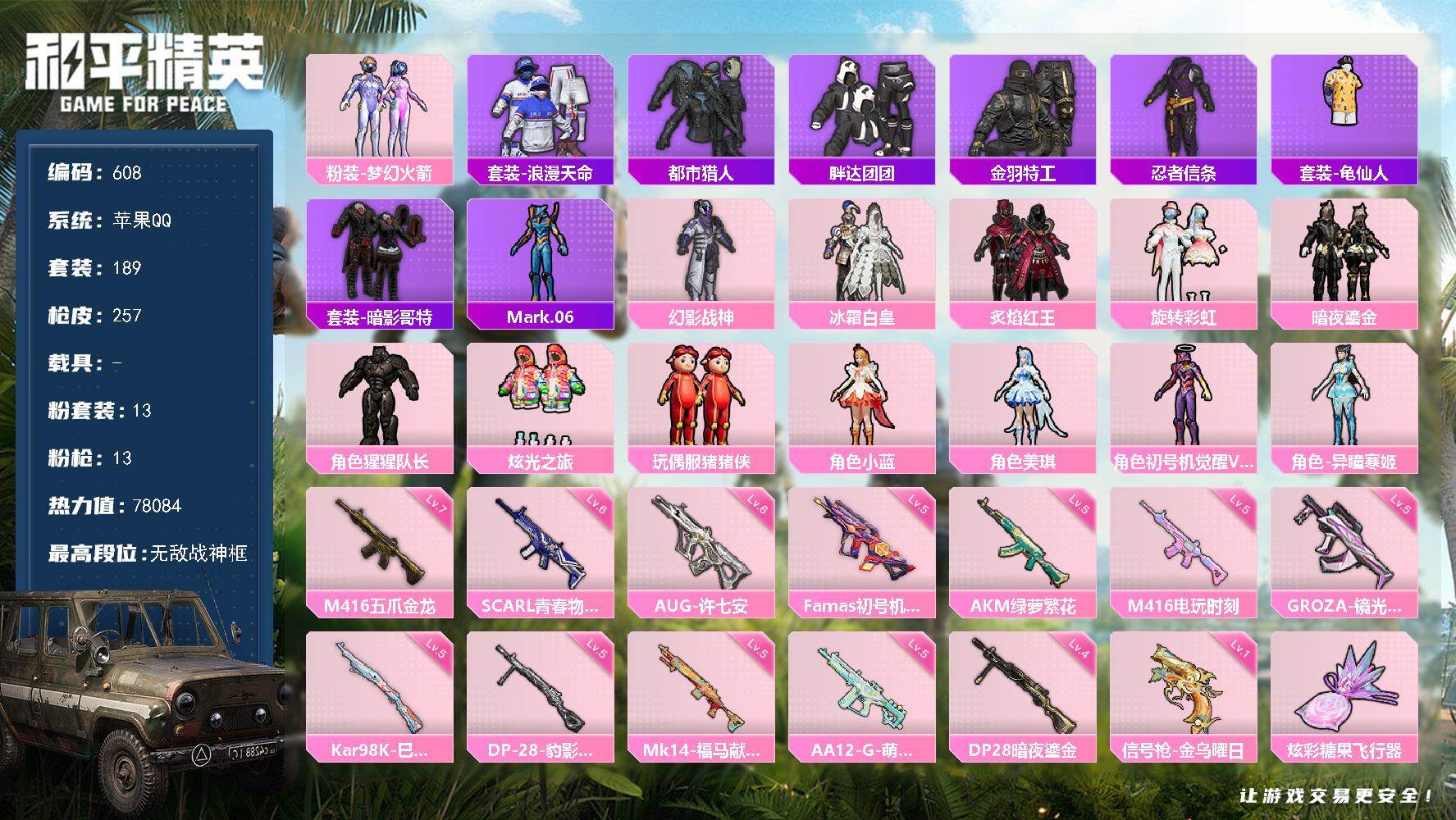 苹果手Q-无敌战神框-13粉装-13特效枪-3粉色飞行器-78084热力值-9