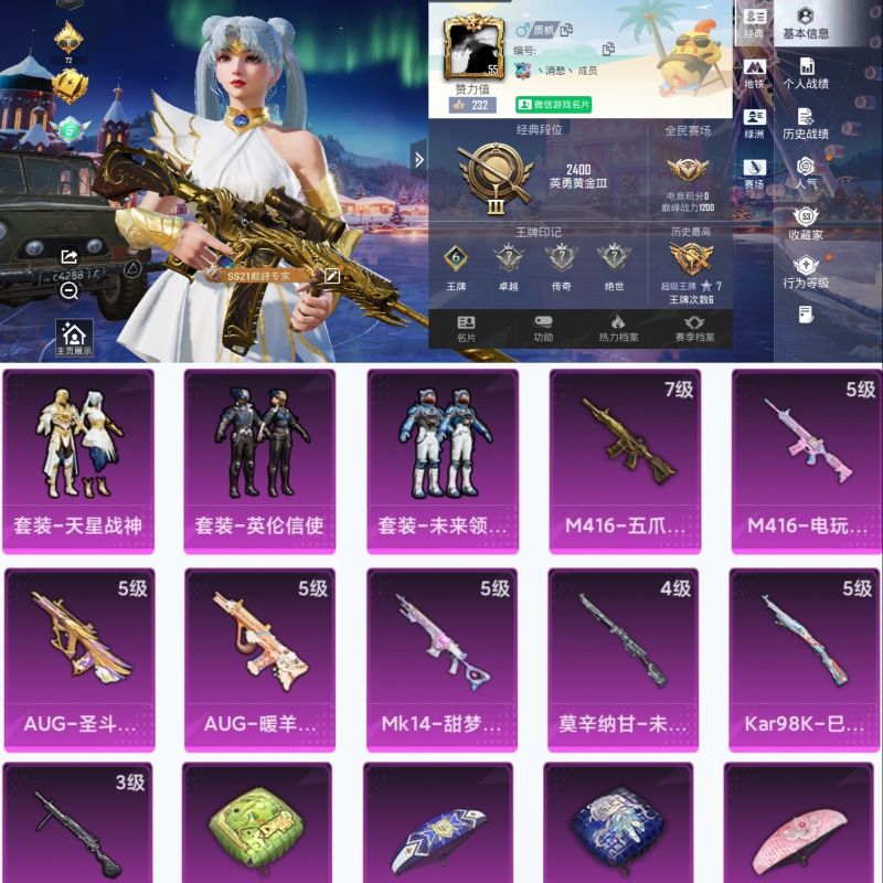DD430【3粉装8特效枪】双字ID 地铁声望30级 安V-81套装 148枪皮(可二次)43195热力值 6印记 历史超级王牌7星 【3粉装】天星战神 未来领航者 英伦信使【1头盔】墨龙九天头盔 【8特效枪】M416-五爪金龙(7级) M416-电玩时刻(5级) Kar98K-巳巳如意(5级) DP-28-豹影疾电(3级) AUG-圣斗士星矢(5级) A