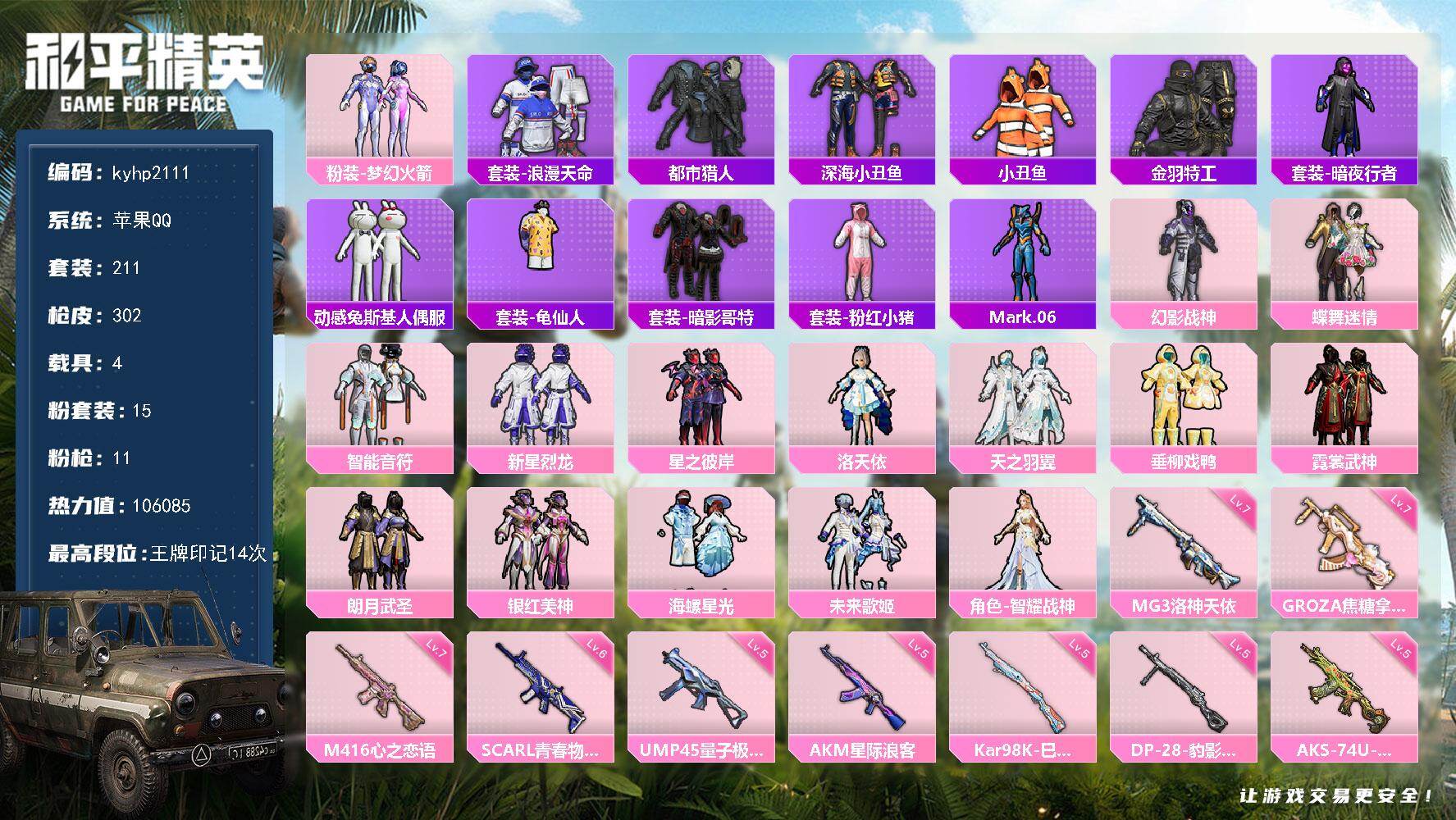 苹果 手Q-15粉装-11特效枪-4载具-8粉色飞行器-106085热力值-14