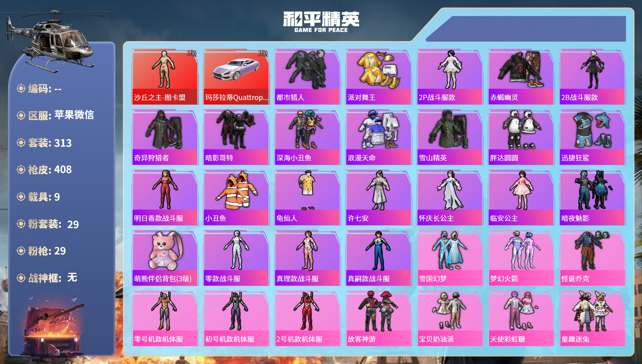 苹果微信-27王牌印记-1红装-29粉装-29特效枪-9载具-热力