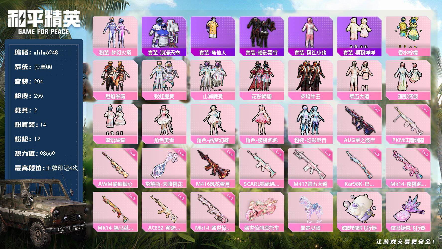 安卓 手Q-14粉装-12特效枪-2载具-10粉色飞行器-93559热力值-4王