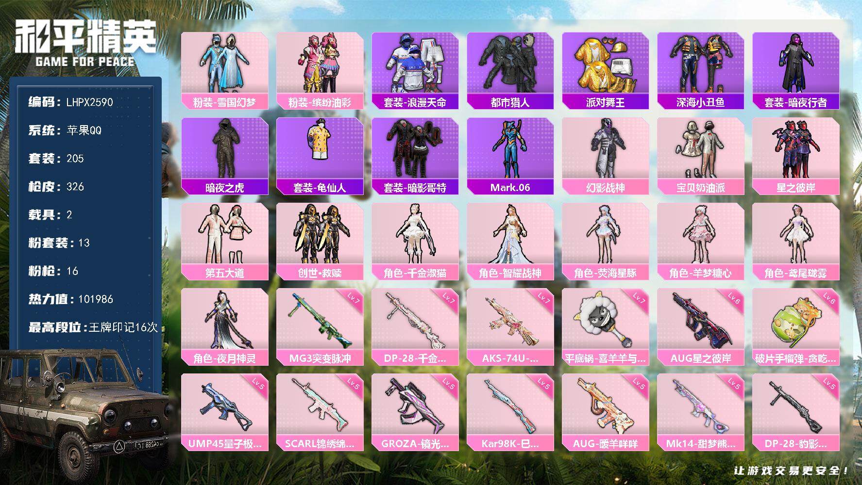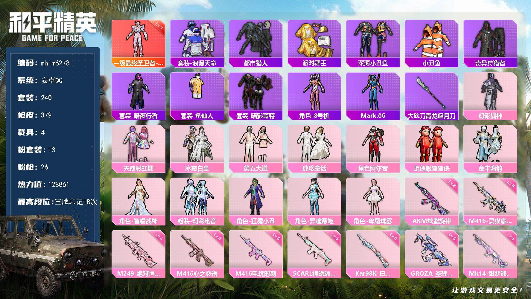 安卓 手Q-1神装-5粉装-16特效枪-1载具-3粉色飞行器-67020热力值-