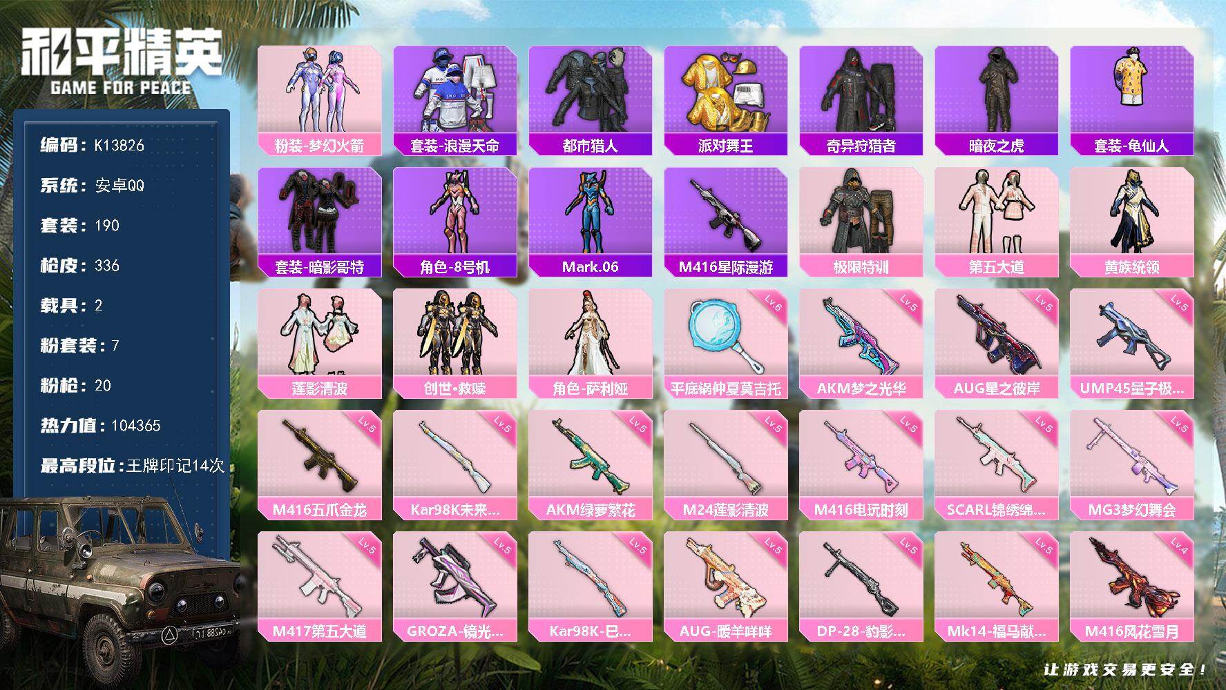 安卓 手Q-7粉装-20特效枪-2载具-4粉色飞行器-104365热力值-14王