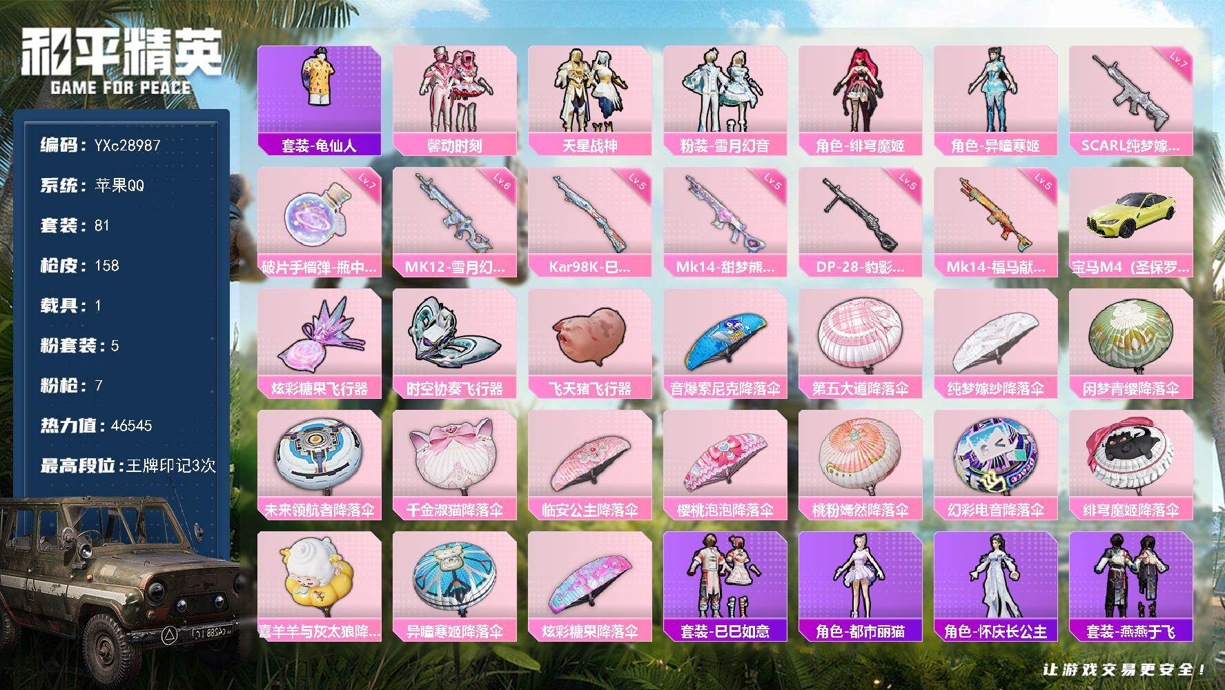 苹果手Q-31王牌印记-有战神框-27粉装-17特效枪-2载具-