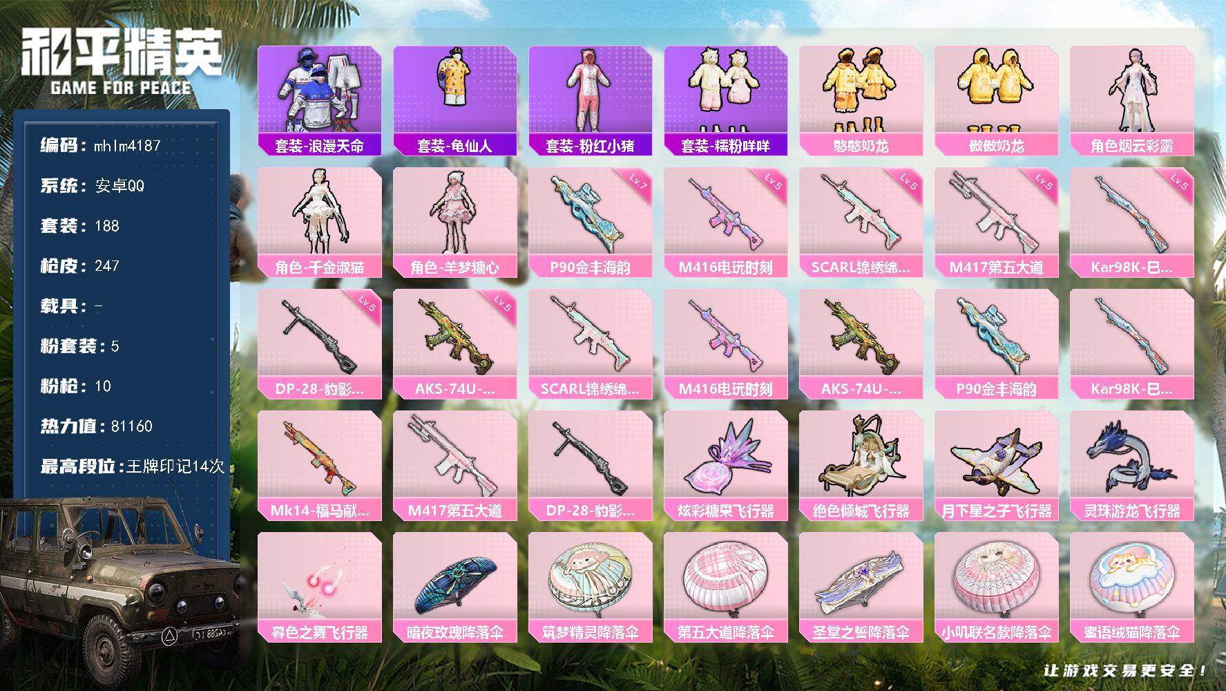 hs61645 安卓手Q-14王牌印记-4粉装-7特效枪-69587热力值-187套装-242枪皮-
