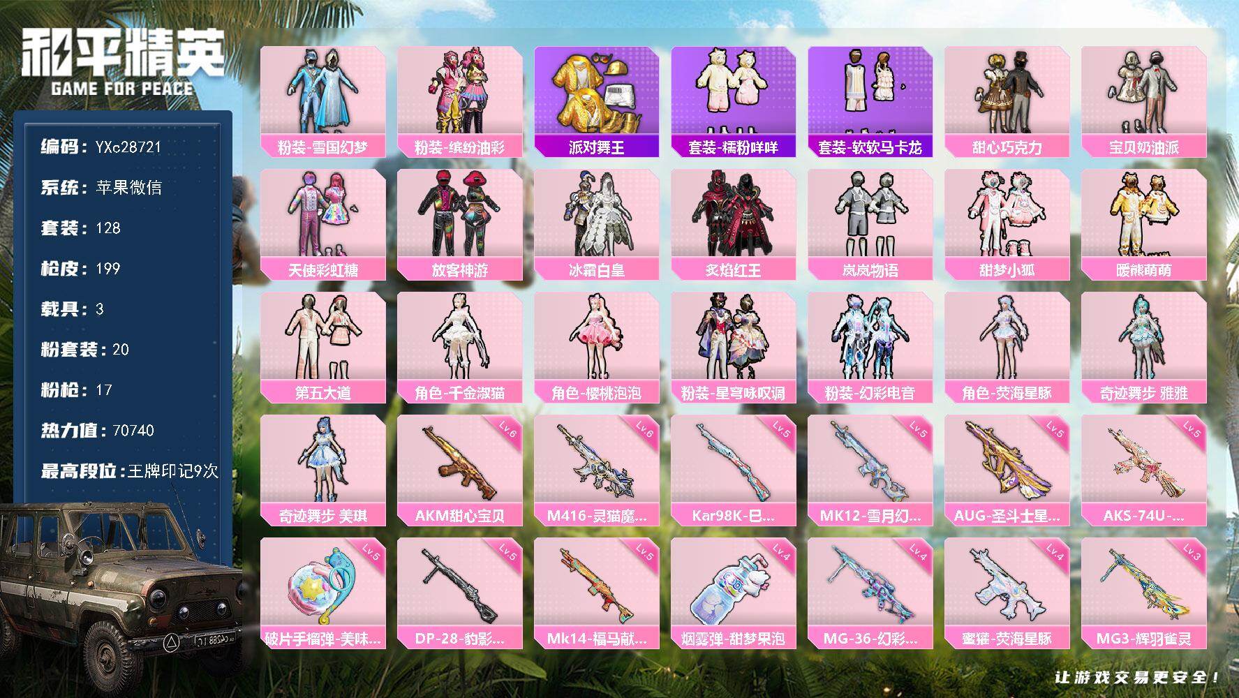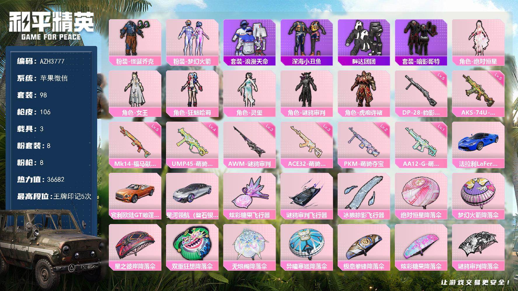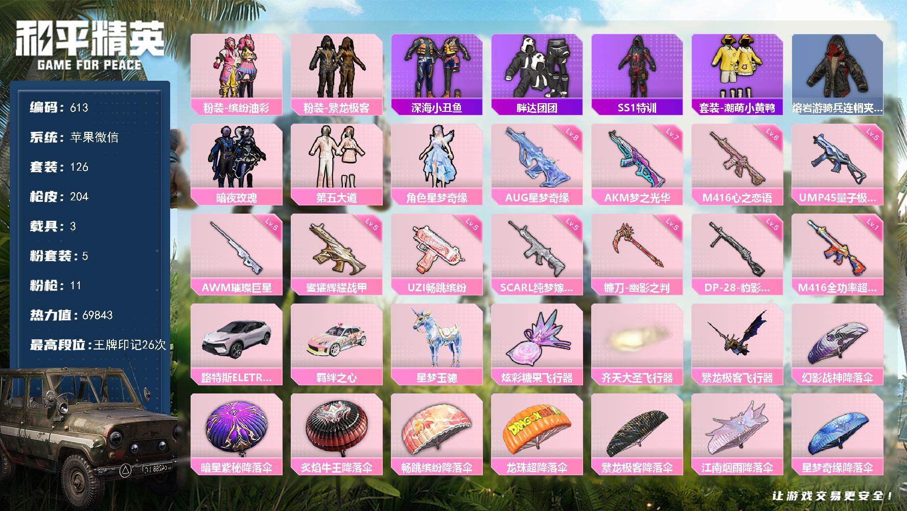 苹果 微信-5粉装-11特效枪-3载具-3粉色飞行器-69843热力值-26王