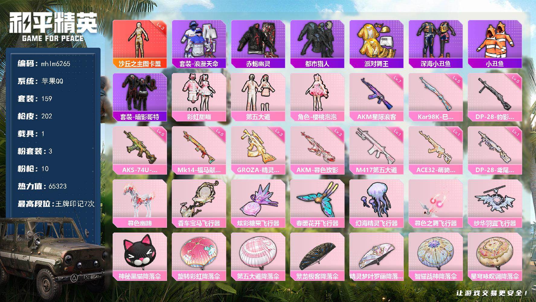 苹果 手Q-1神装-3粉装-10特效枪-1载具-7粉色飞行器-65323热力值-