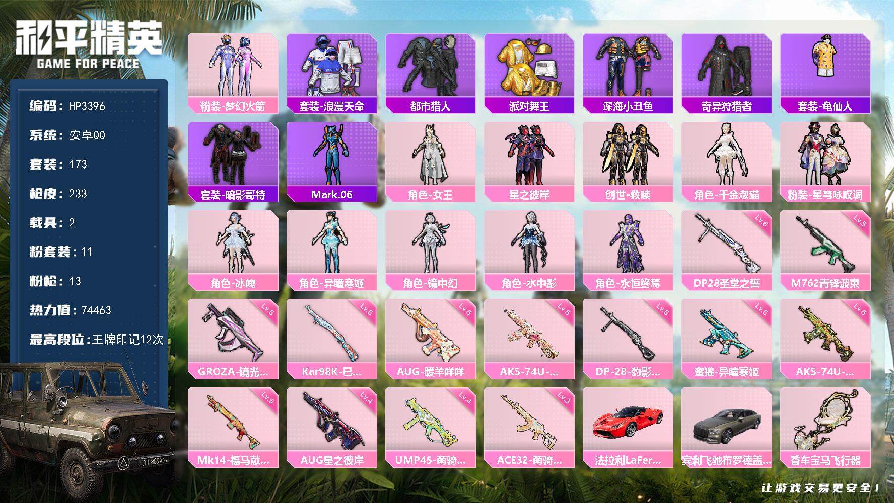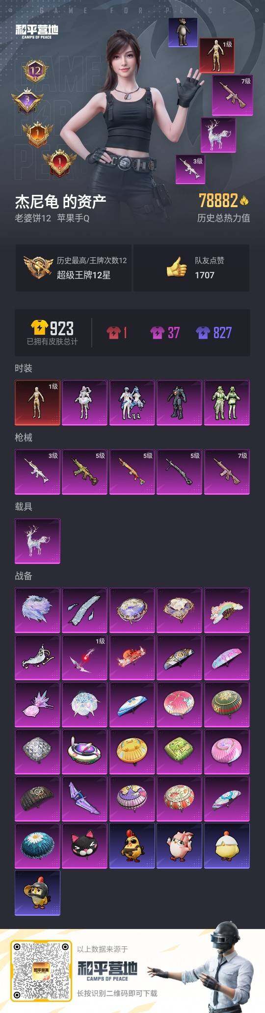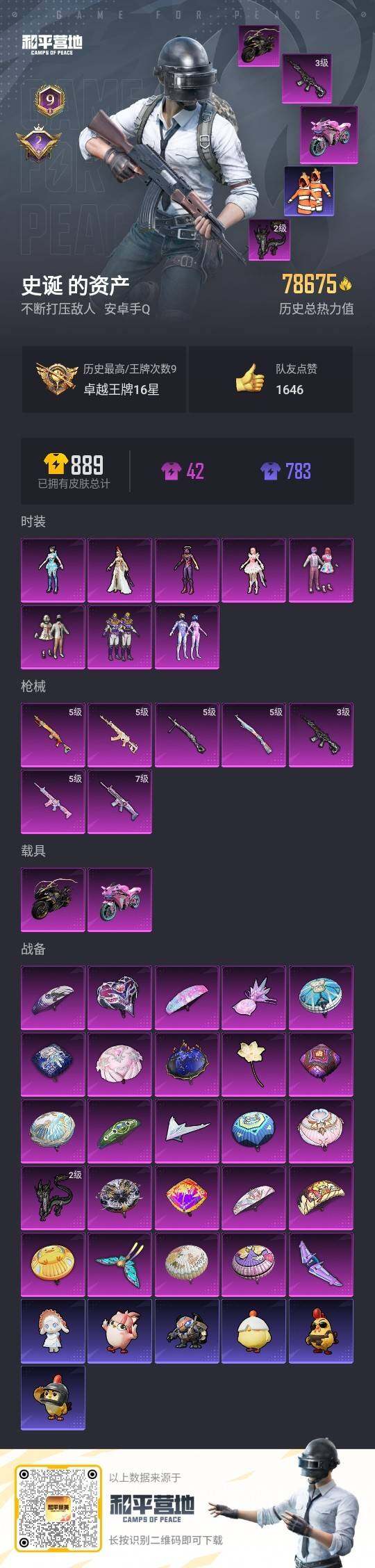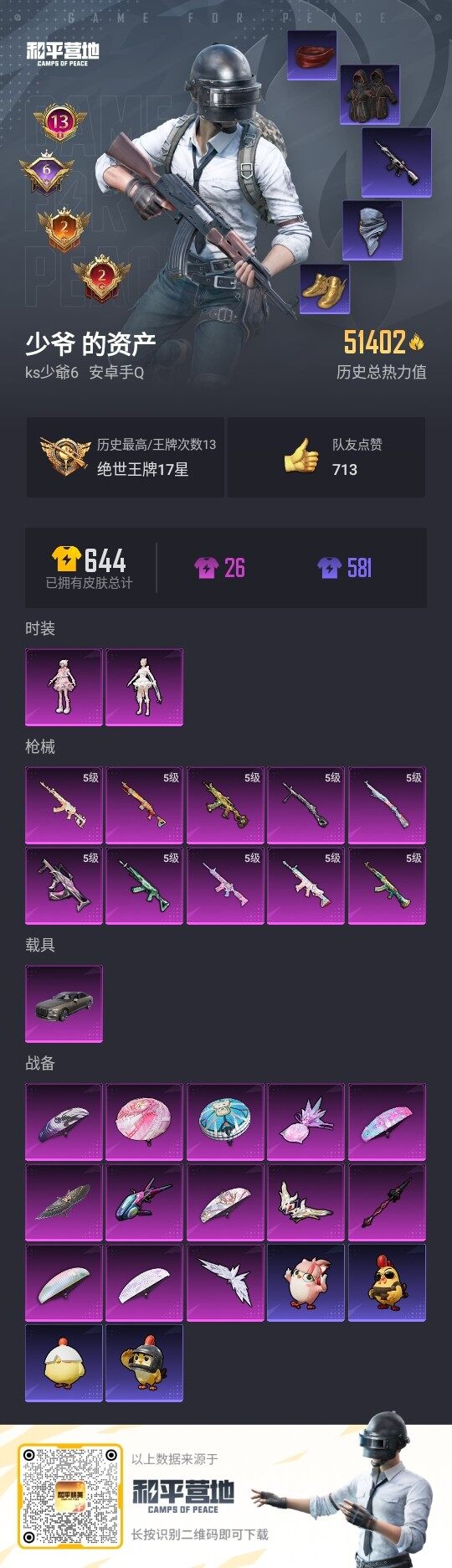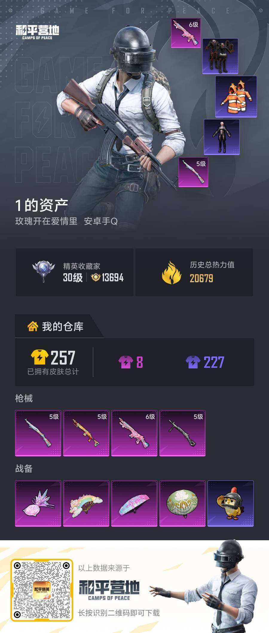 173套装/枪械13/装备275/载具2/战备178/王牌印记12/热力值74463/