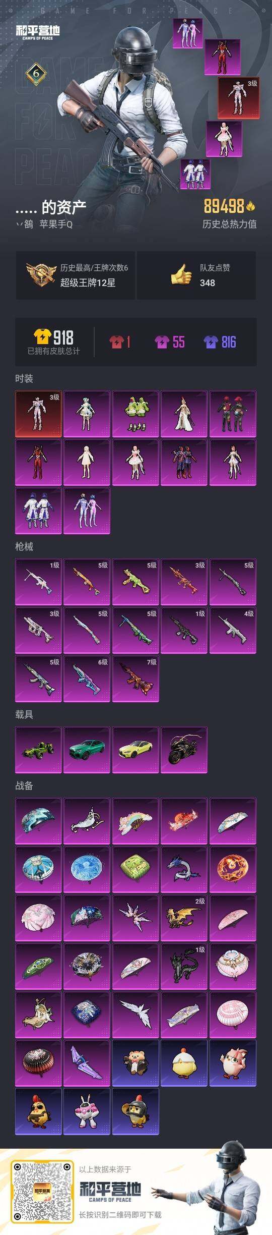 1神装-11粉装-13特效枪-4载具-8粉色飞行器-89498热力值-6王牌印记-183套装-231枪皮