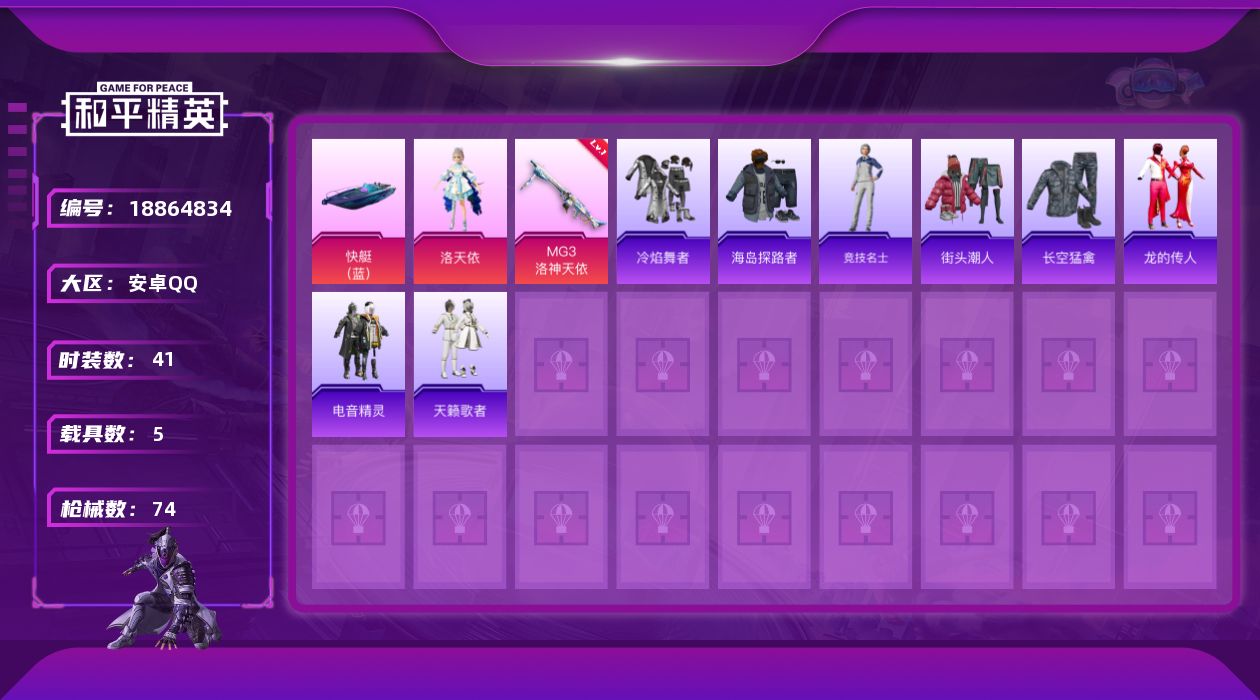 1神装-4粉装-9特效枪-5载具-5粉色飞行器-34005热力值-1王牌印记-41套装-74枪皮