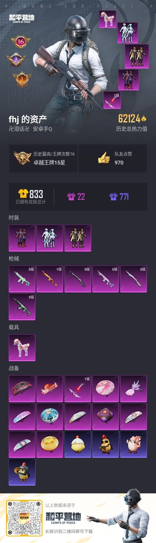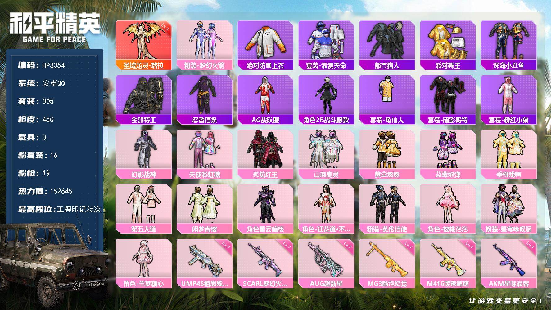 305套装/枪械19/装备633/载具3/战备321/王牌印记25/热力值152645/