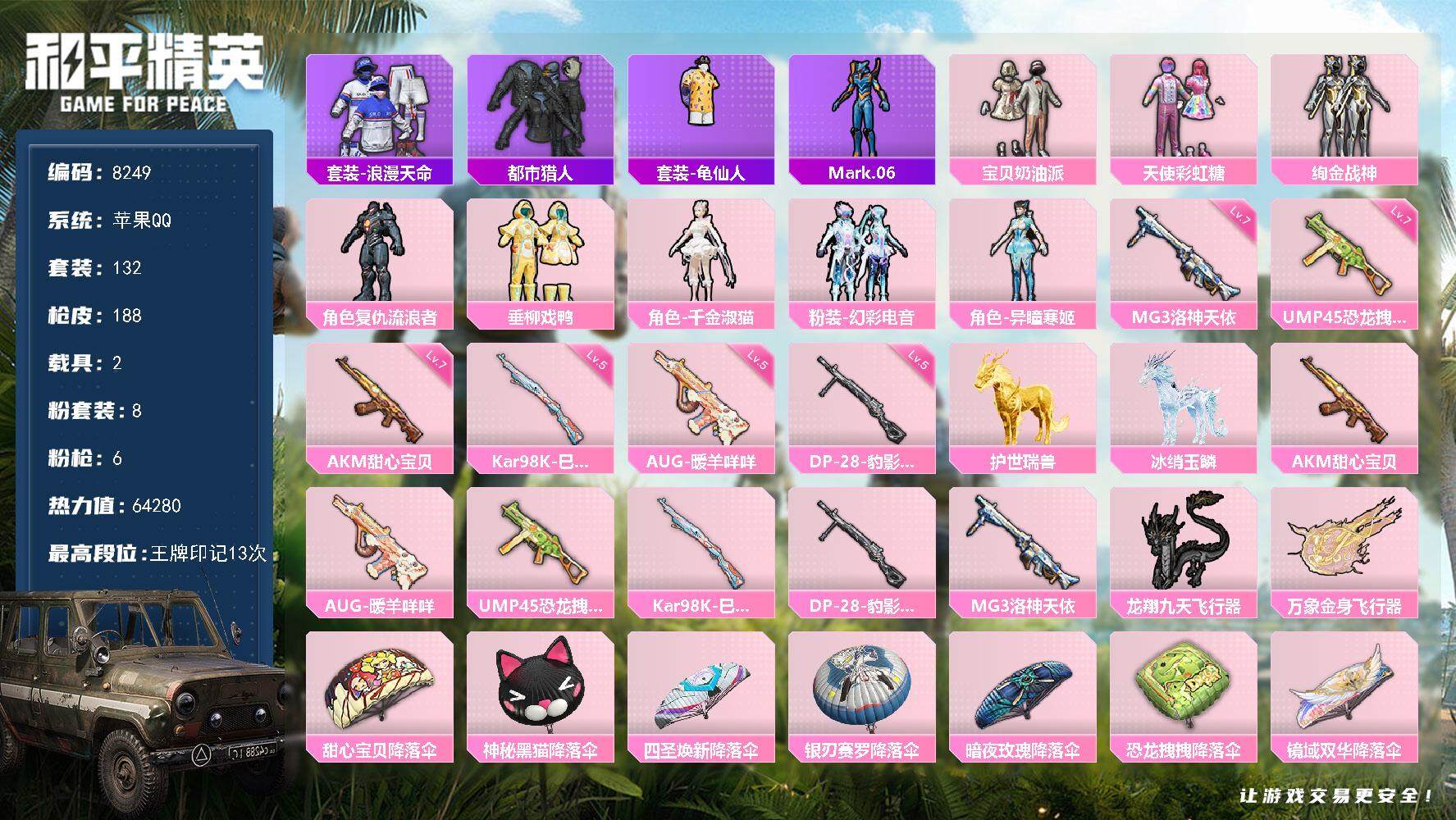 【8249】8粉装-6特效枪-2载具-2粉色飞行器-64280热力值-13王牌