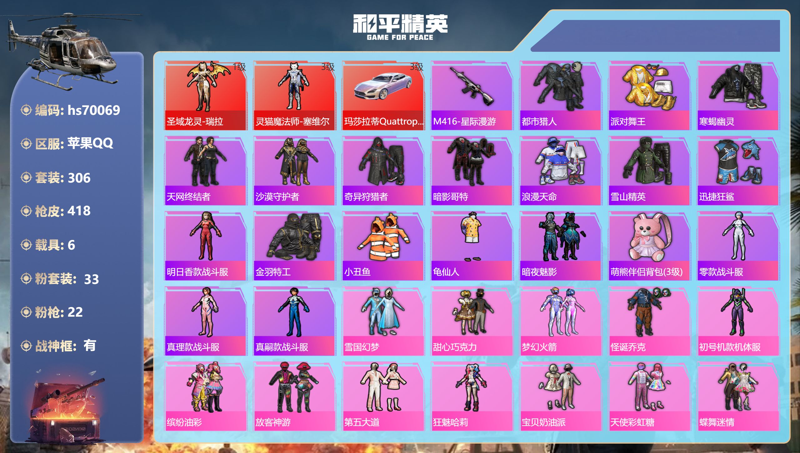24王牌印记-有战神框-2红装-33粉装-22特效枪-6载具-热力值-306套装-418枪皮-7卓越印记-5传奇印记