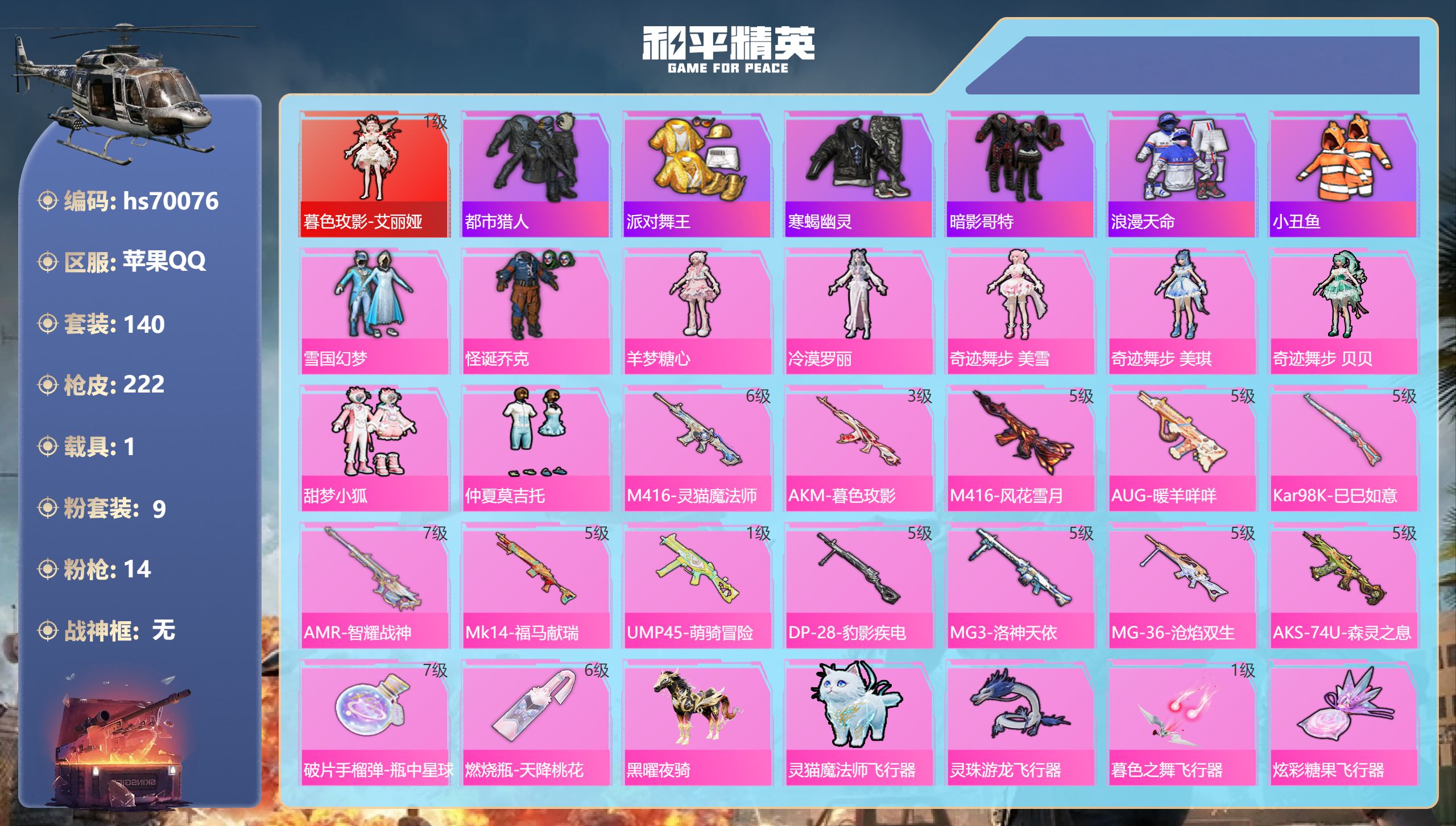 无敌战神框-8粉装-8特效枪-2载具-0粉色飞行器-70434热力值-13王牌印记-175套装-225枪皮