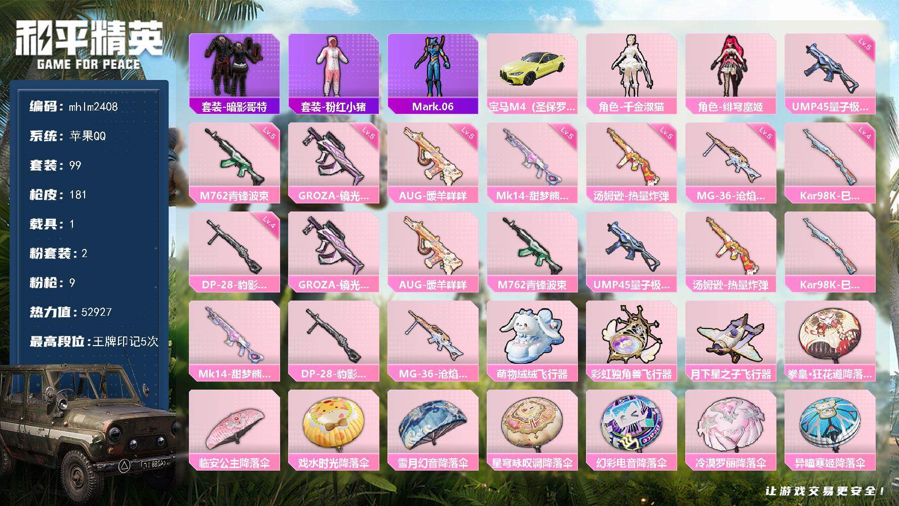 和平精英【苹果QQ】【mhlm2408】苹果 手Q-2粉装-9特效枪-1载具-3粉色飞行器-529