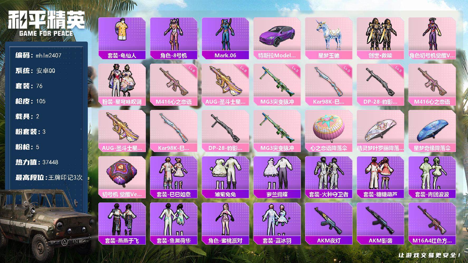 和平精英【安卓QQ】【mhlm2407】安卓 手Q-3粉装-5特效枪-2载具-0粉色飞行器-374
