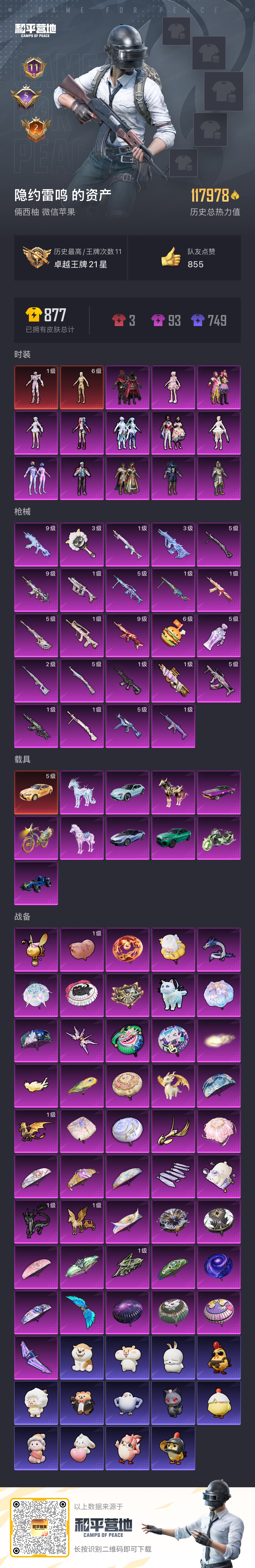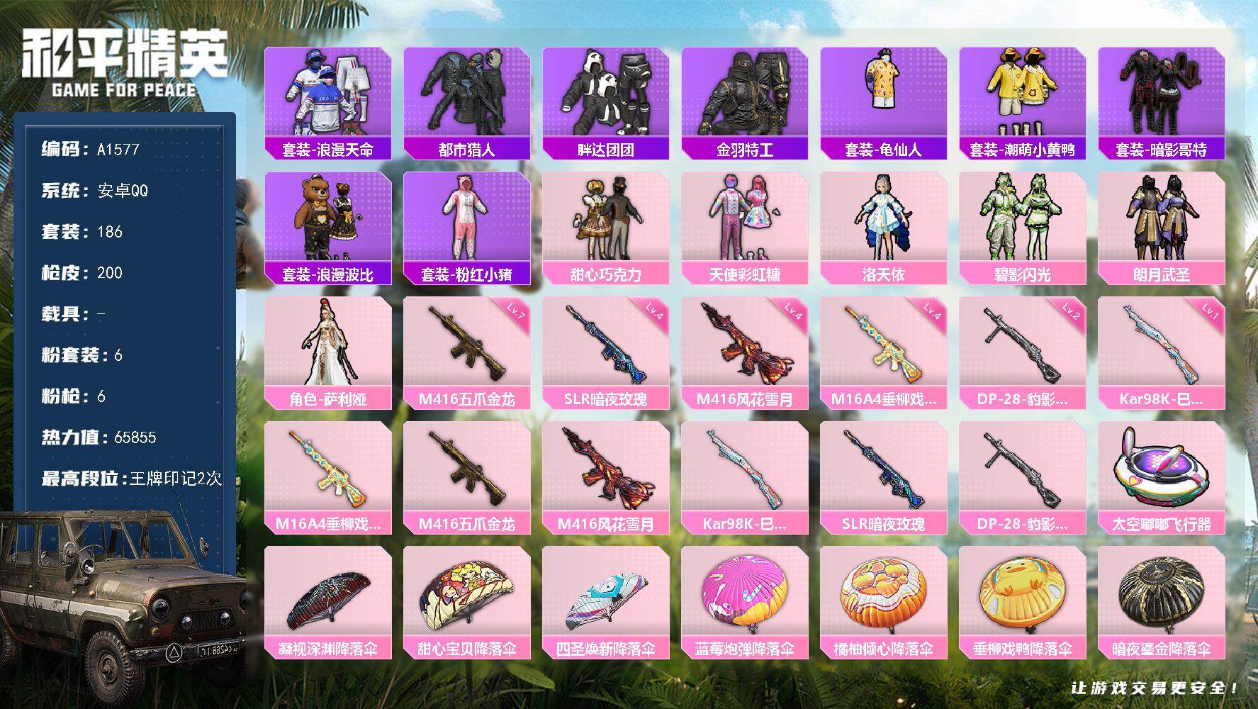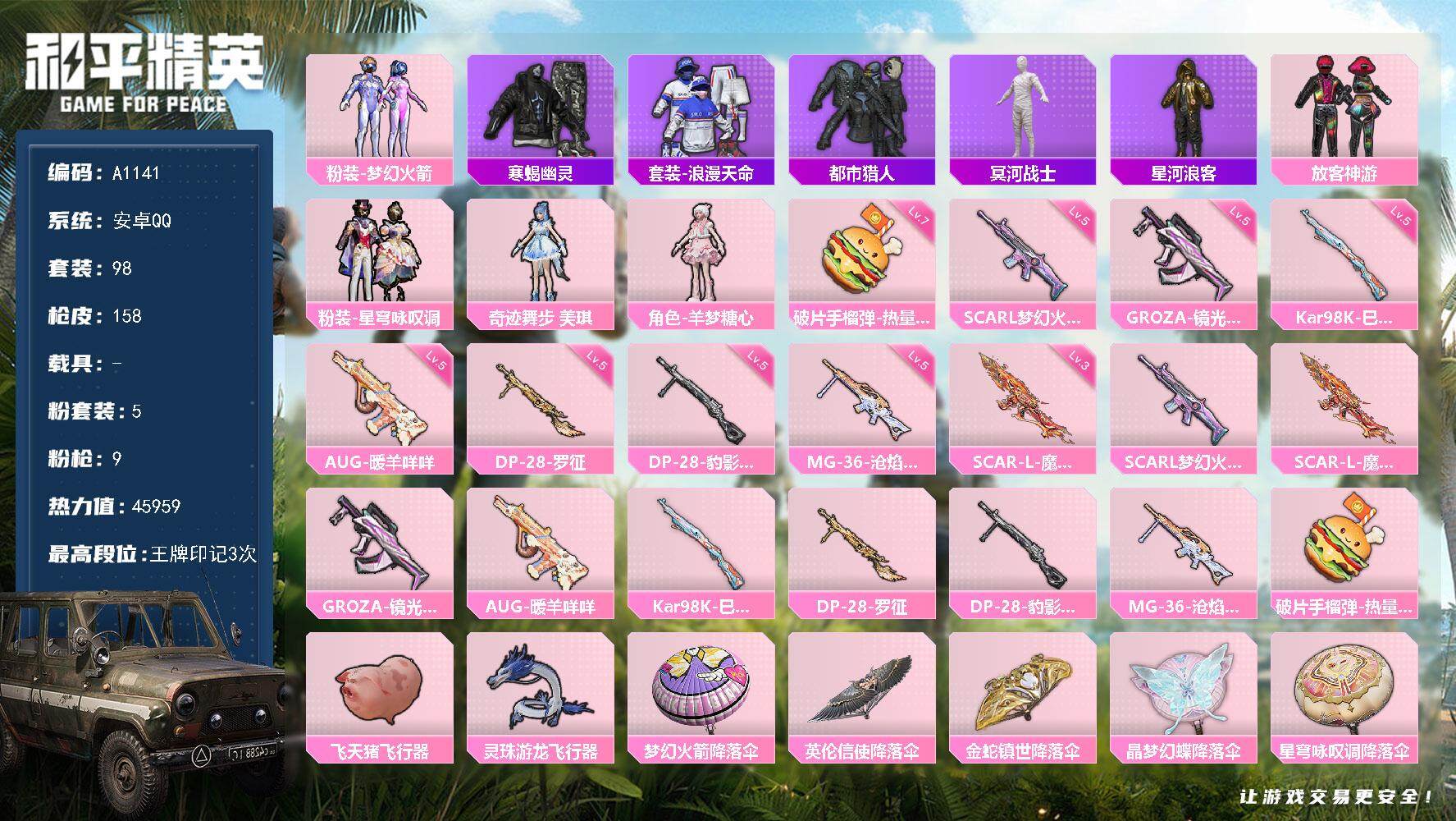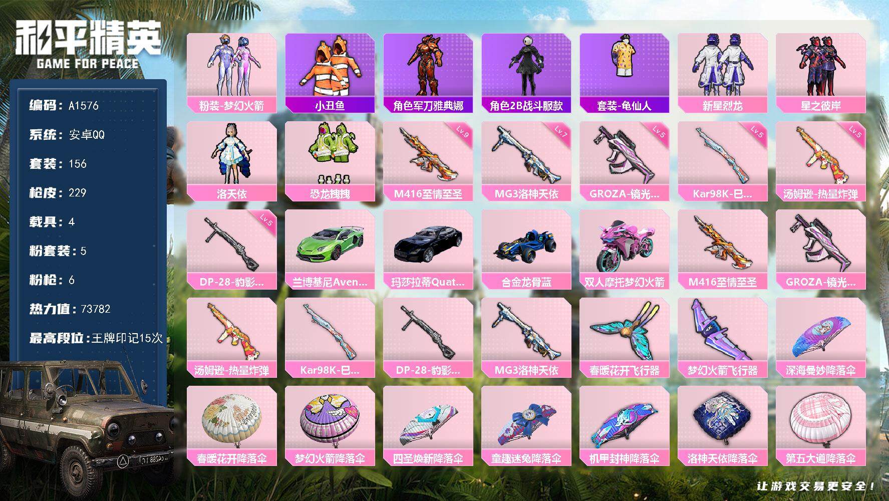安卓QQ-无二次包人脸-9王牌印记-9粉装-5红装-20特效枪-8载具-110644热力值-战备72