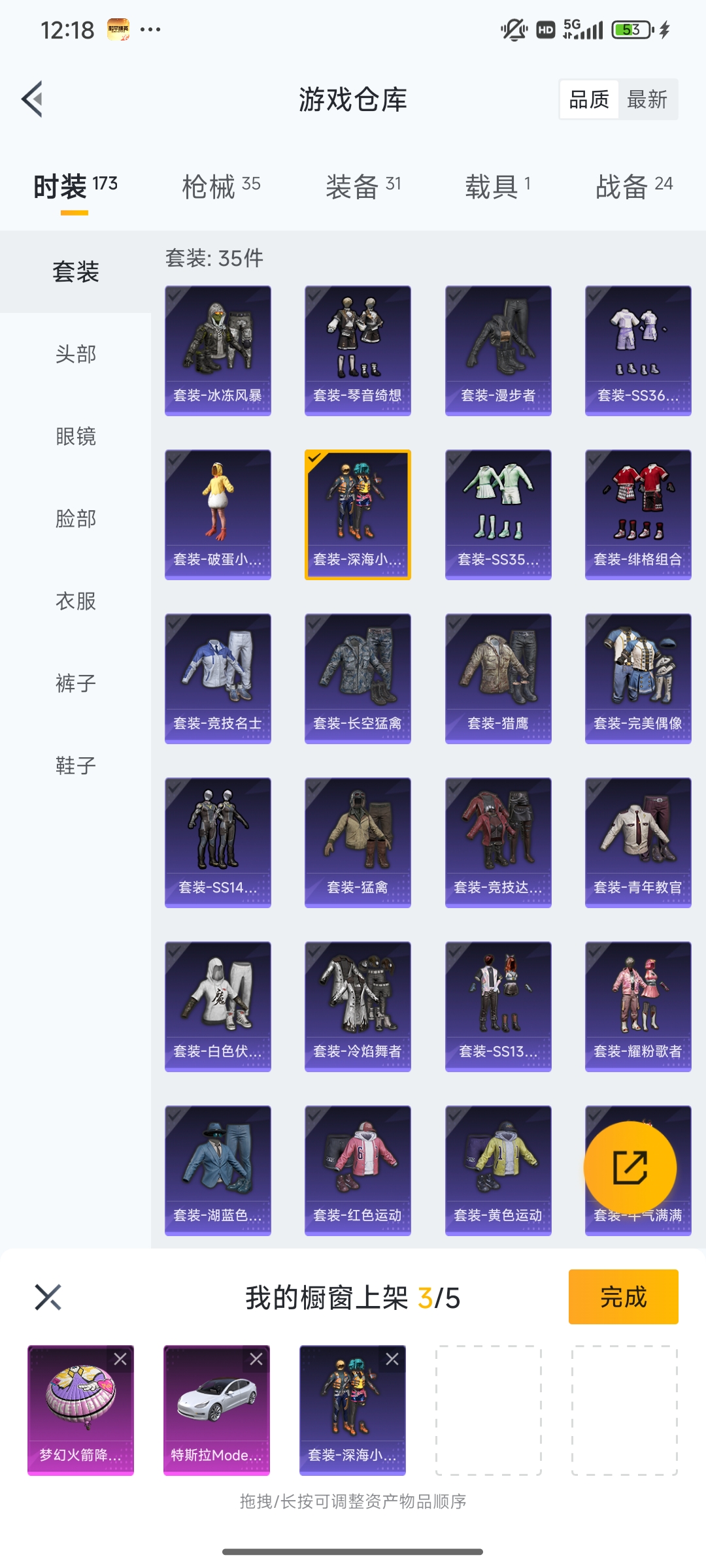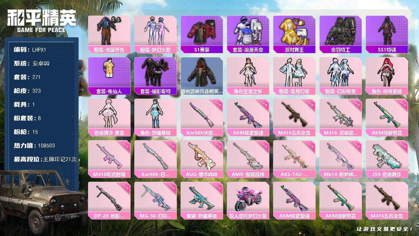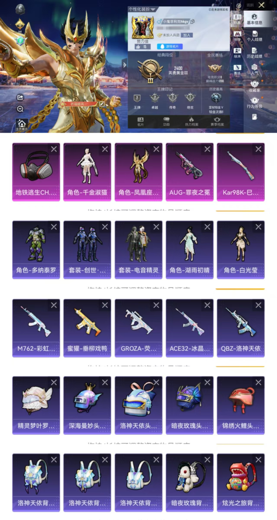 98套装/枪械3/装备180/载具1/战备109/王牌印记5/热力值39321/七级M762
