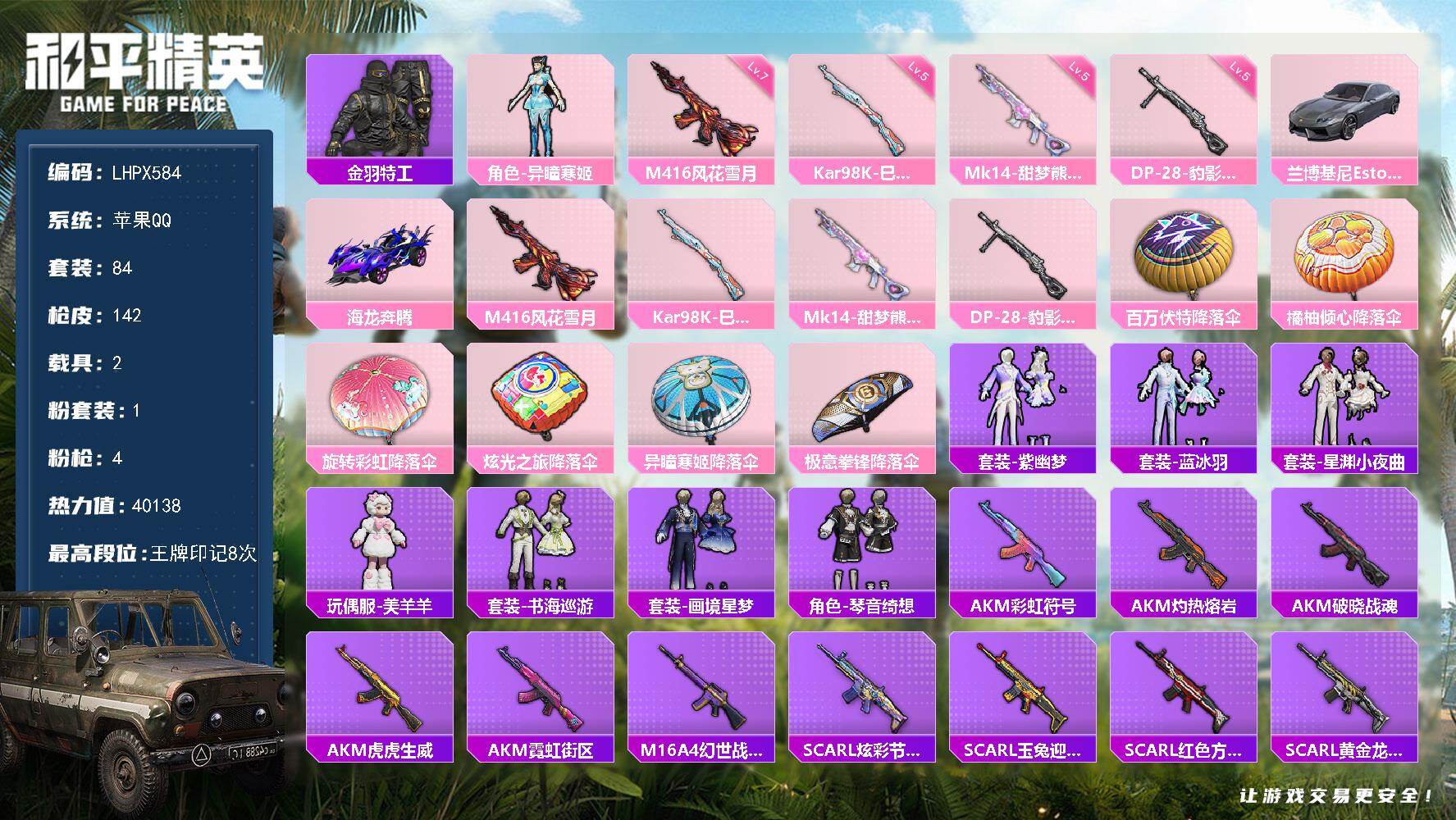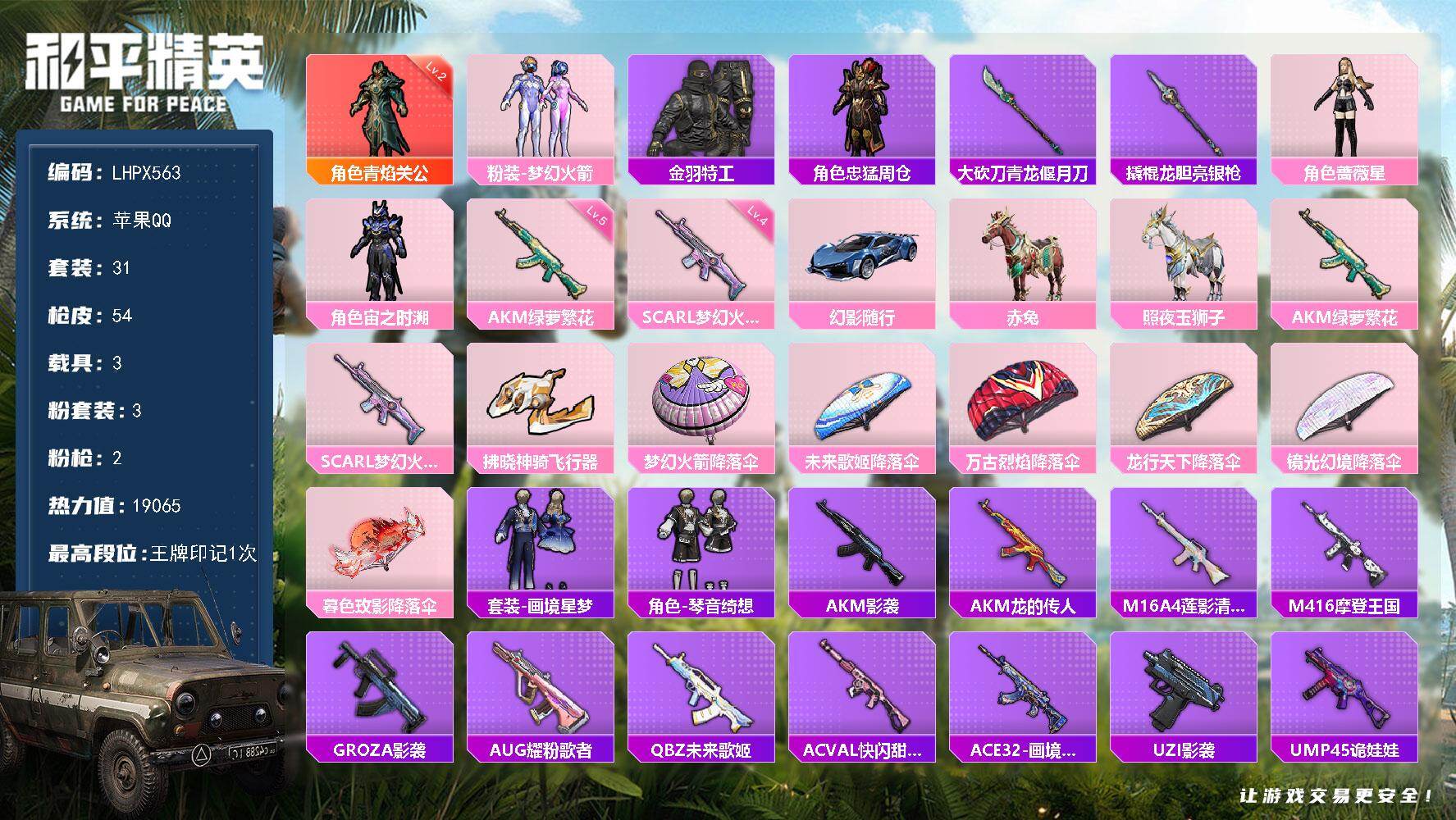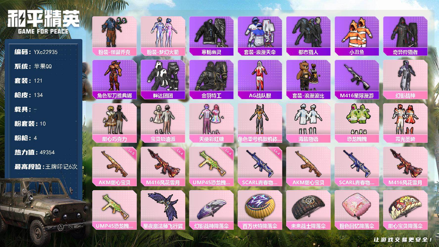 【店主推荐捡漏号!可直接换绑】苹果 手Q-1神装-3粉装-2特效枪-3载具-1