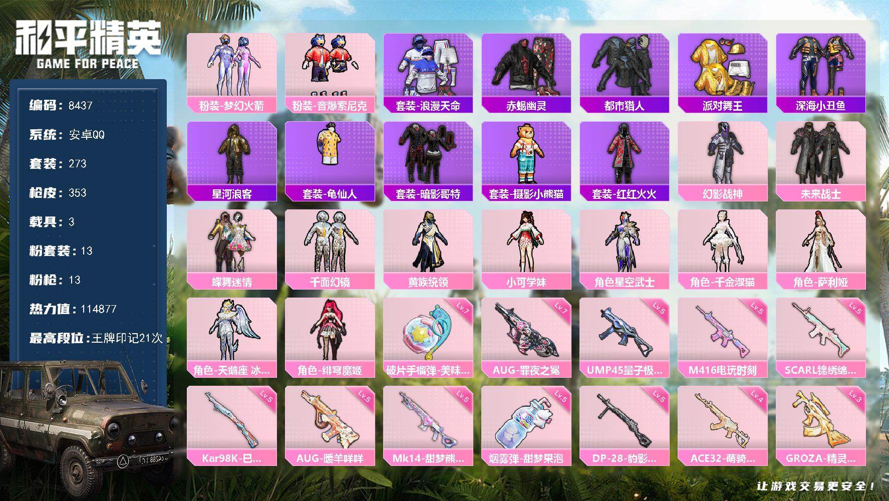 安卓 手Q-20粉装-11特效枪-1载具-7粉色飞行器-85029热力值-14
