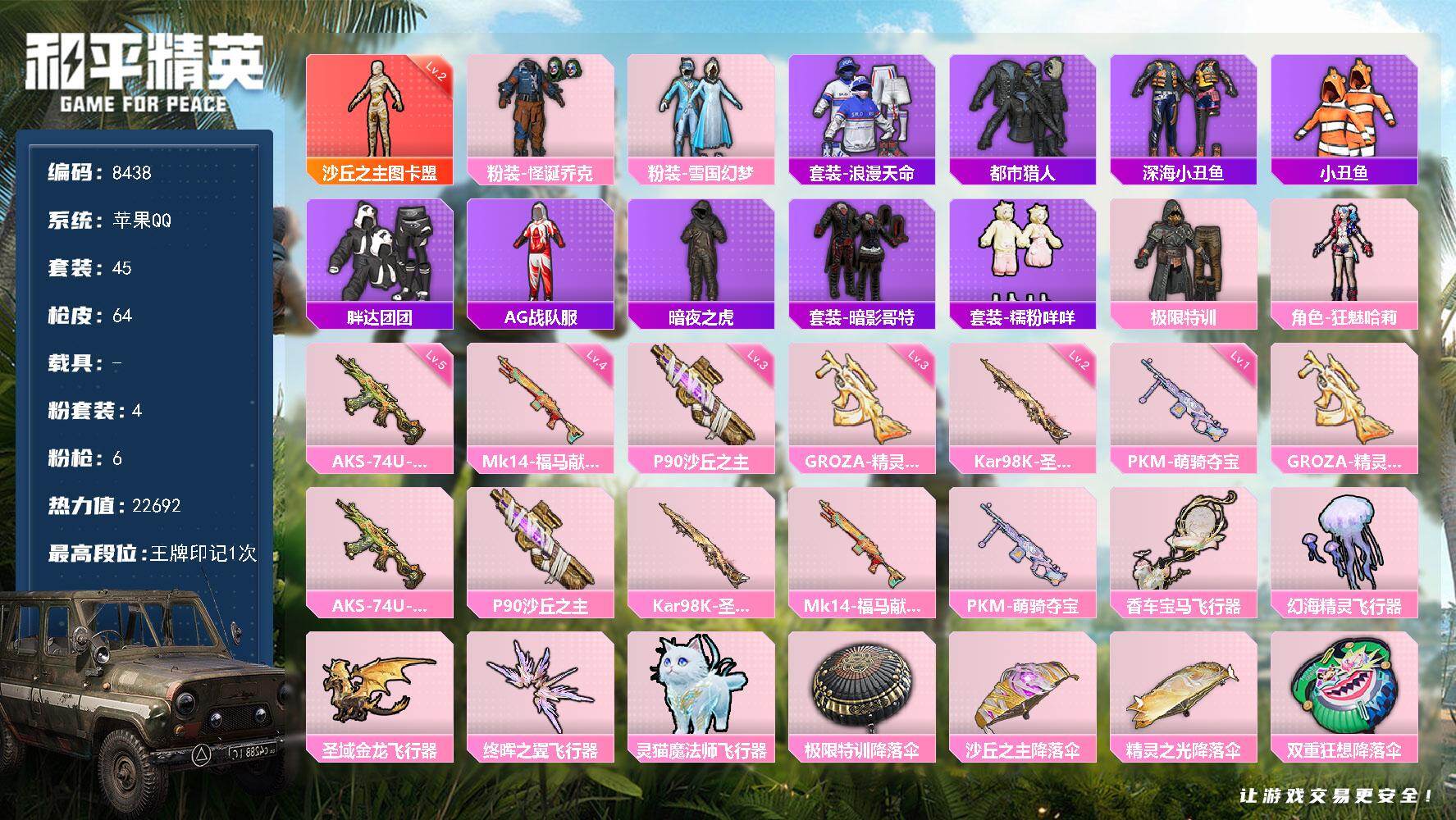 【8438】1神装-4粉装-6特效枪-0载具-6粉色飞行器-22692热力值-