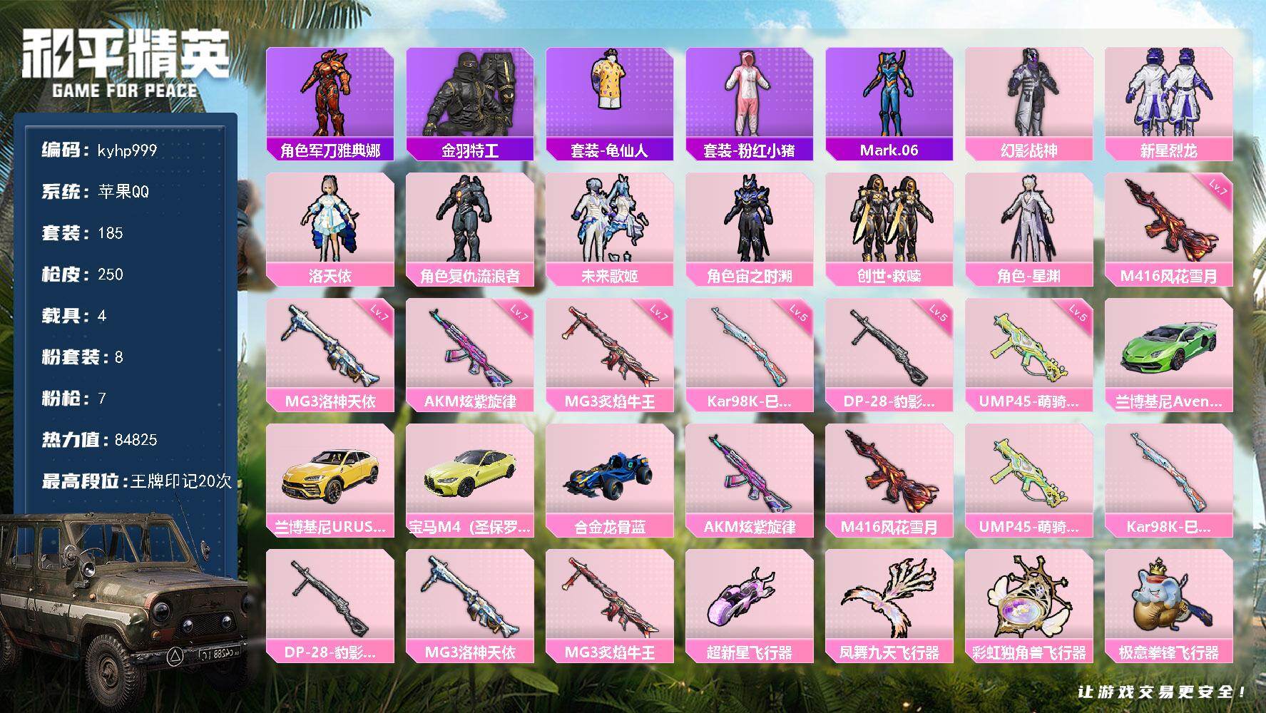 安卓 手Q-1神装-7粉装-13特效枪-6载具-9粉色飞行器