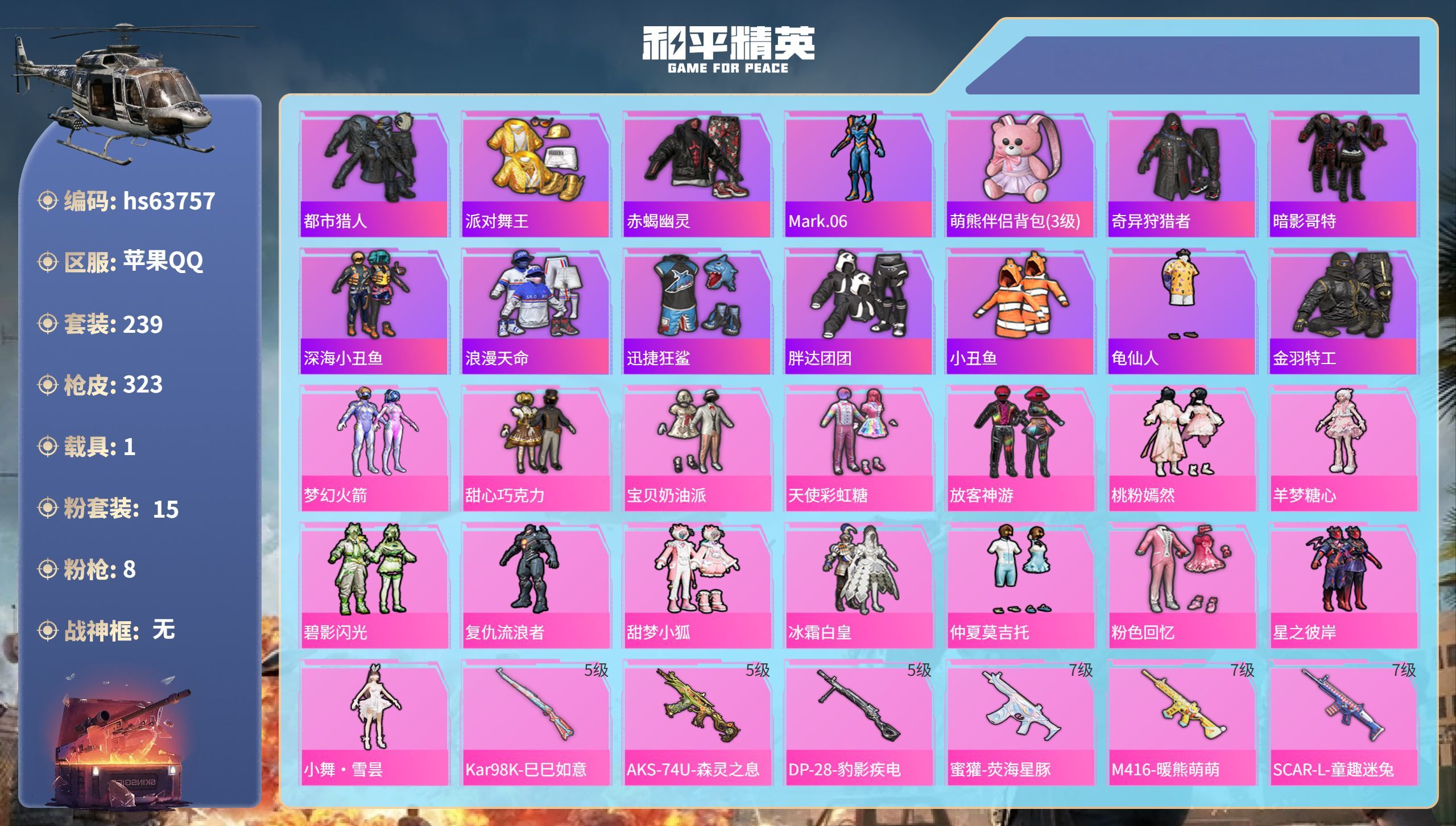 hs63757 苹果手Q-21王牌印记-15粉装-8特效枪-1载具-99962热力值-239套装-3
