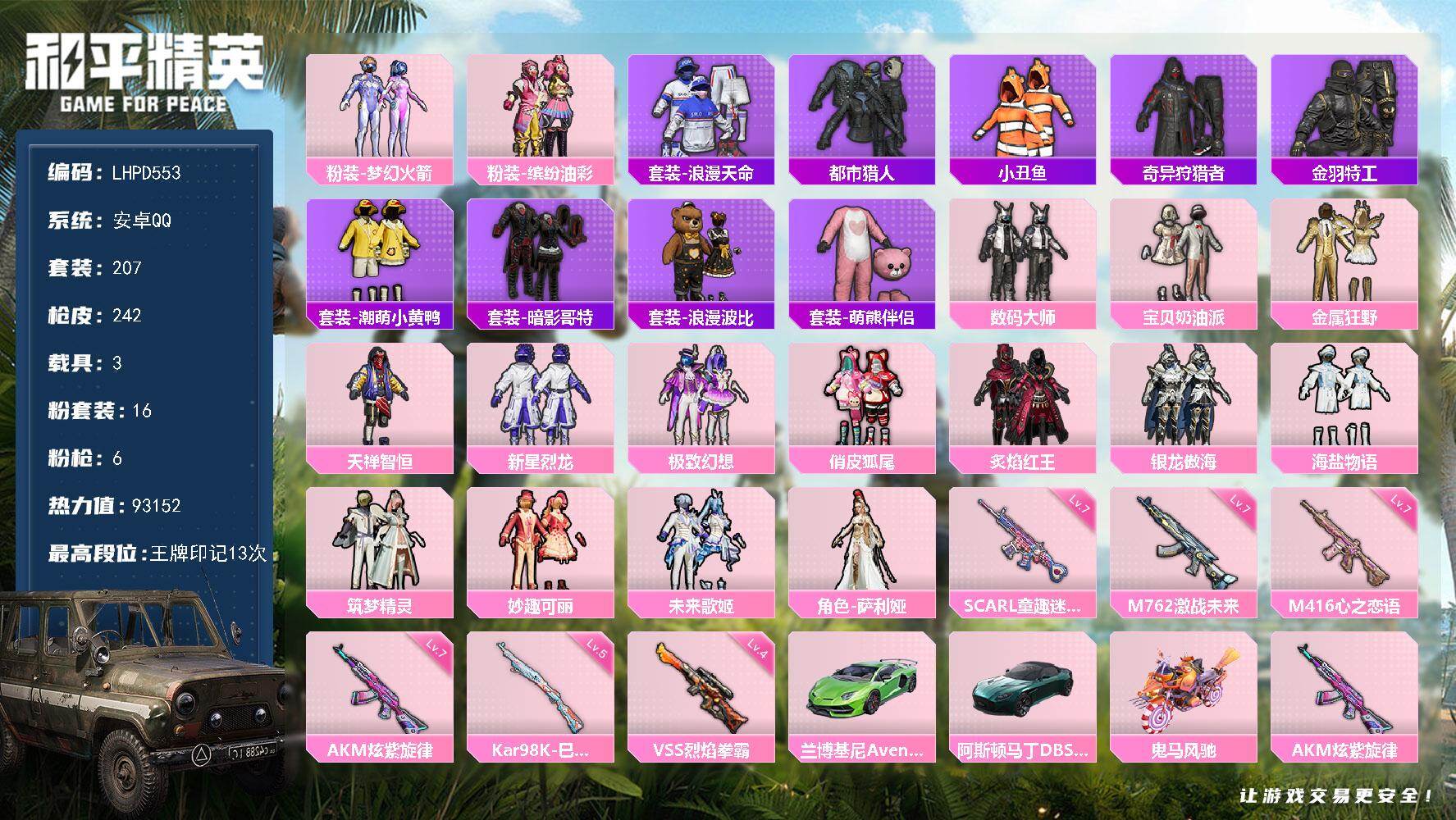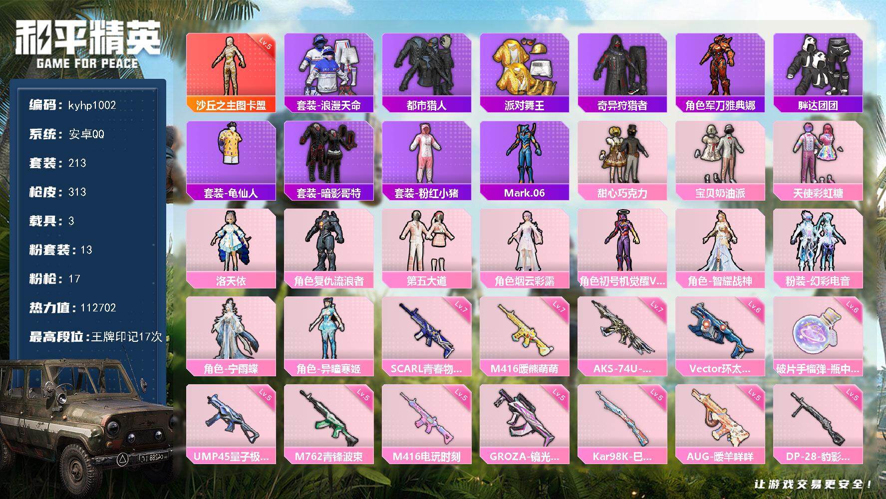hs63530 安卓手Q-16王牌印记-有战神框-18粉装-16特效枪-3载具-111690热力值-