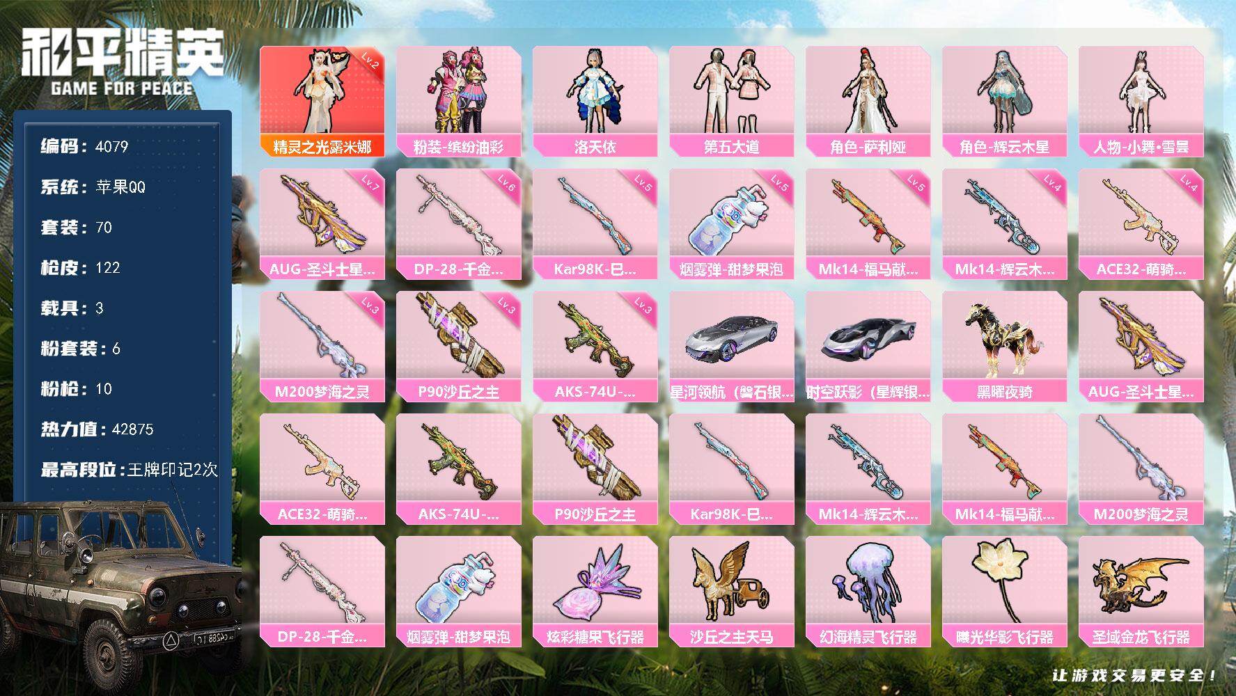 苹果手Q-22王牌印记-有战神框-11粉装-14特效枪-2载具-