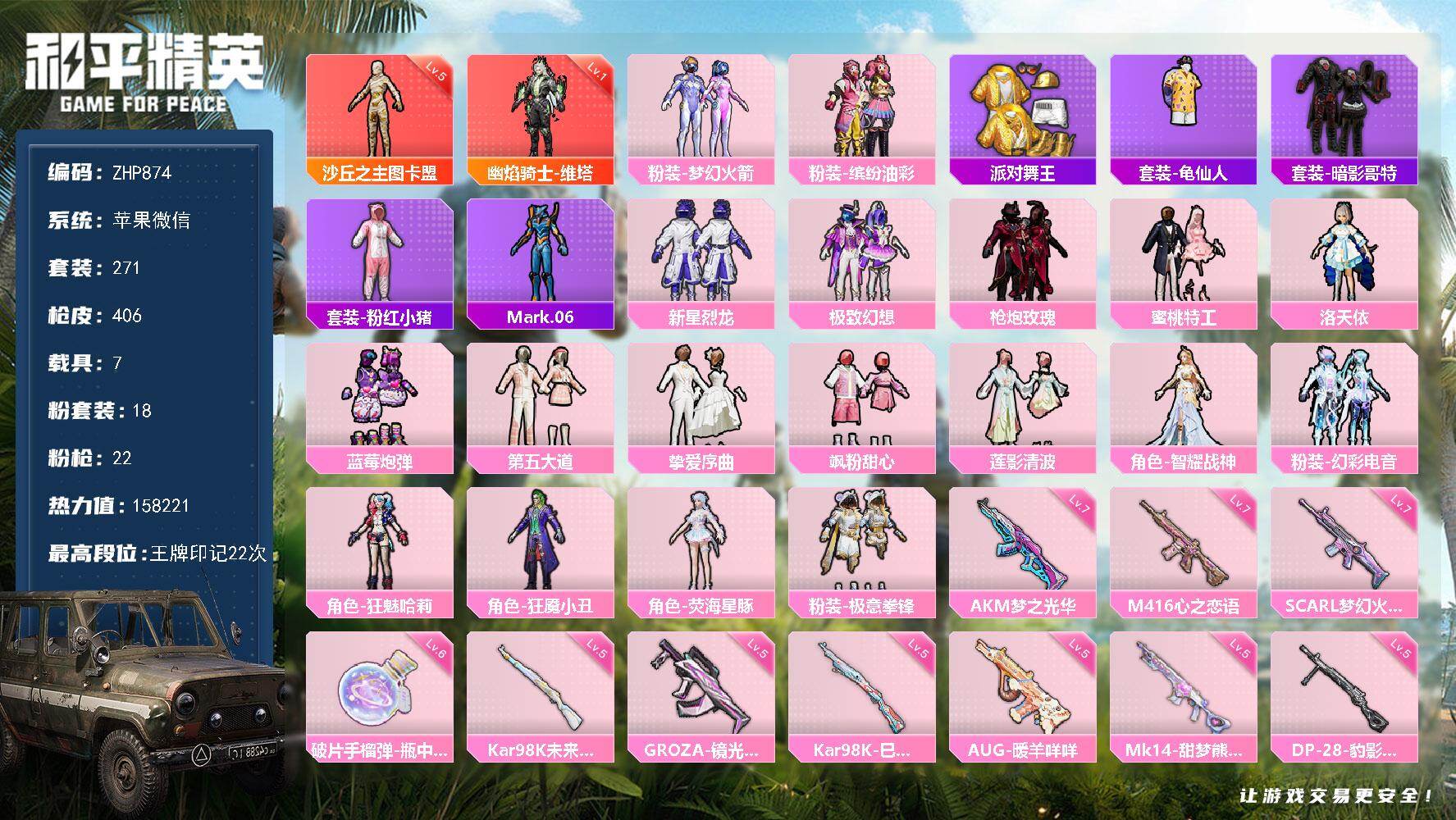 2神装-18粉装-22特效枪-7载具-18粉色飞行器-158221热力值-22王牌印记-271套装-406枪皮