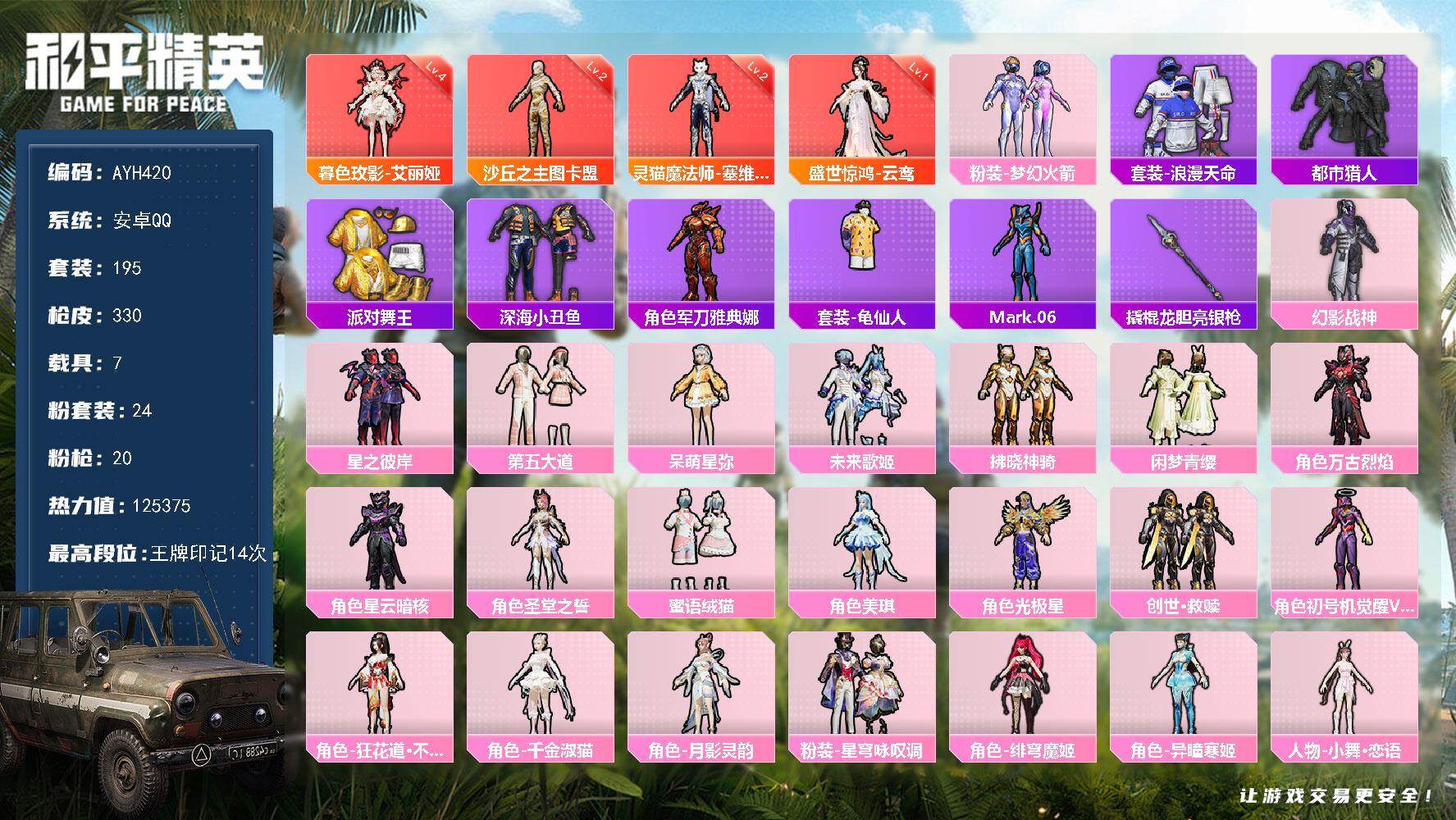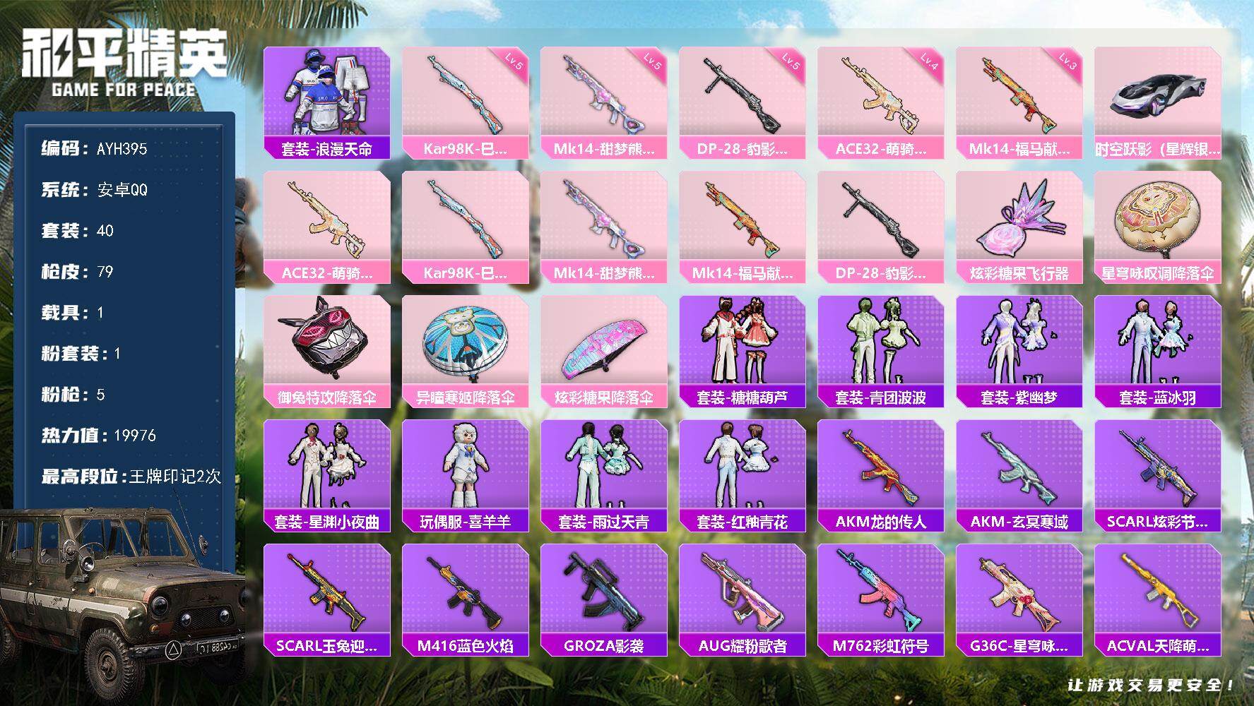 【店主推荐捡漏号】安卓 手Q-4神装-24粉装-20特效枪-7载具-23粉色飞
