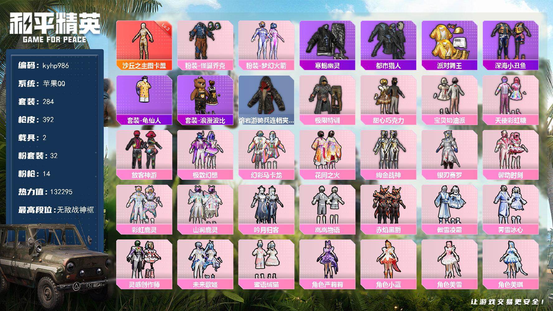 苹果 手Q-无敌战神框-1神装-32粉装-14特效枪-2载具-8粉色飞行器-1